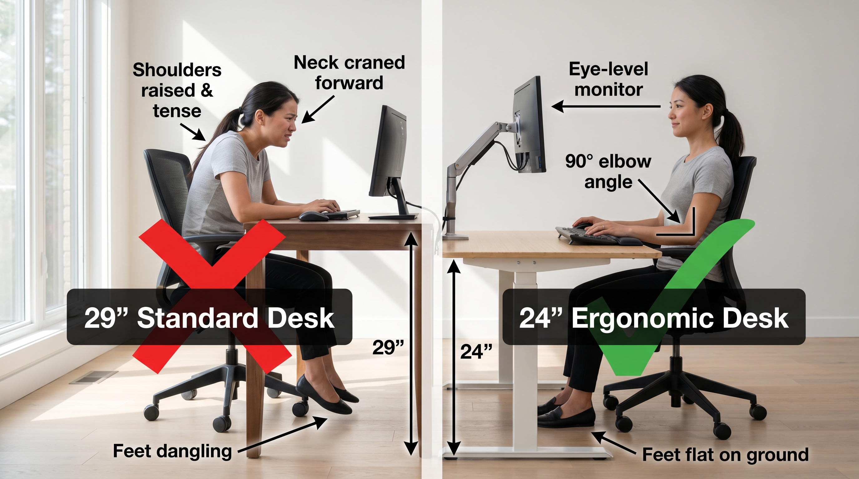 - Over 30% of remote workers under 5'7" report chronic neck and shoulder pain because standard 29-inch desks are too high.