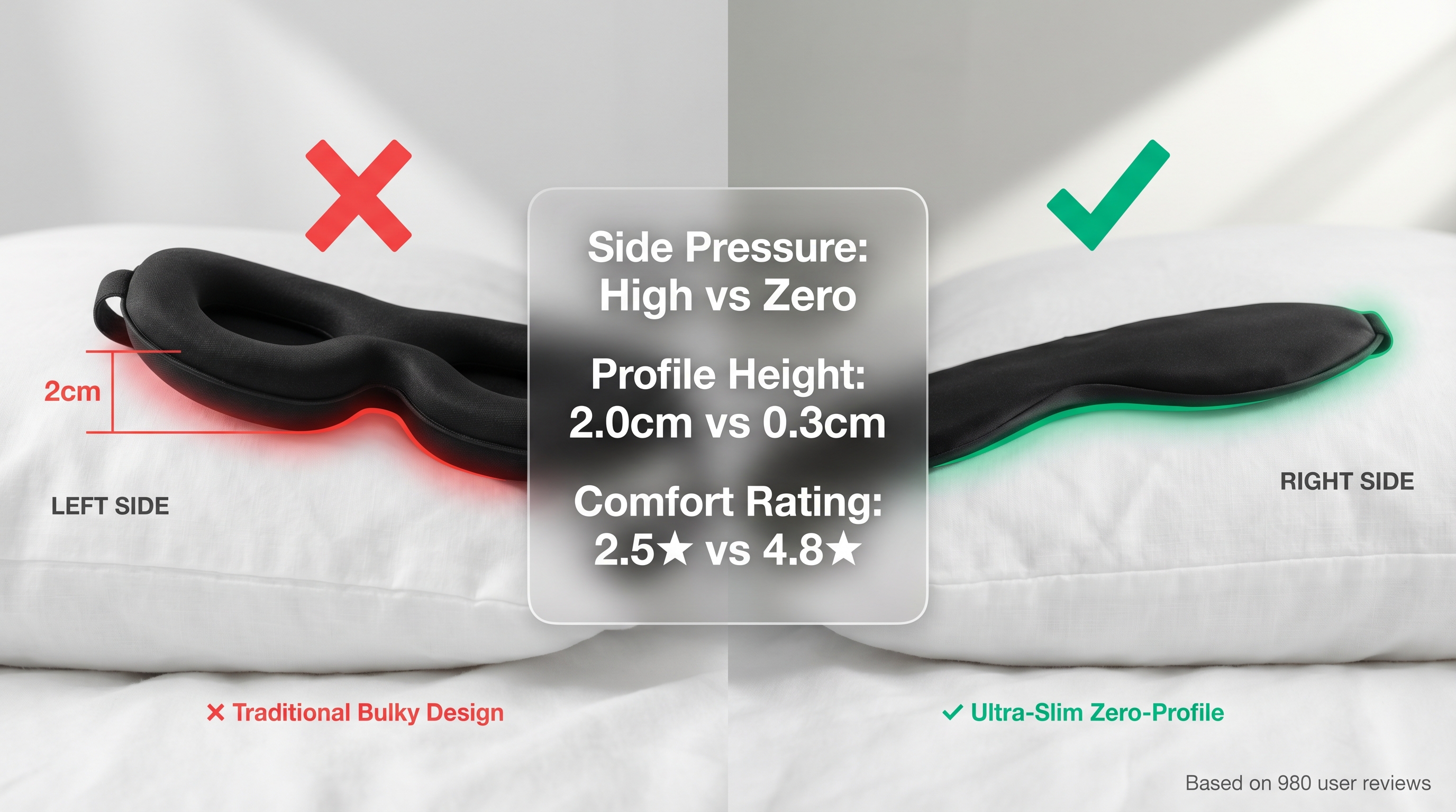 - Light intrusion reduces REM sleep by up to 30%, yet 65% of side sleepers find current blackout masks too painful to wear.