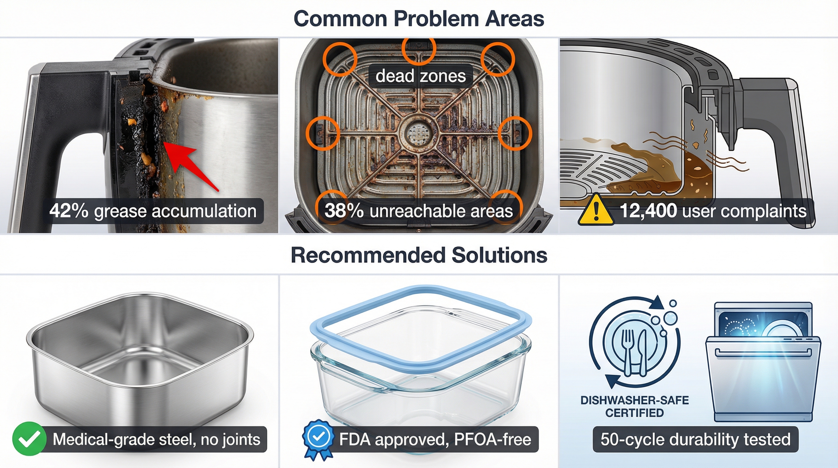 - Common complaint: "My air fryer feels unsanitary despite deep scrubbing; the grease behind the handle never comes out."