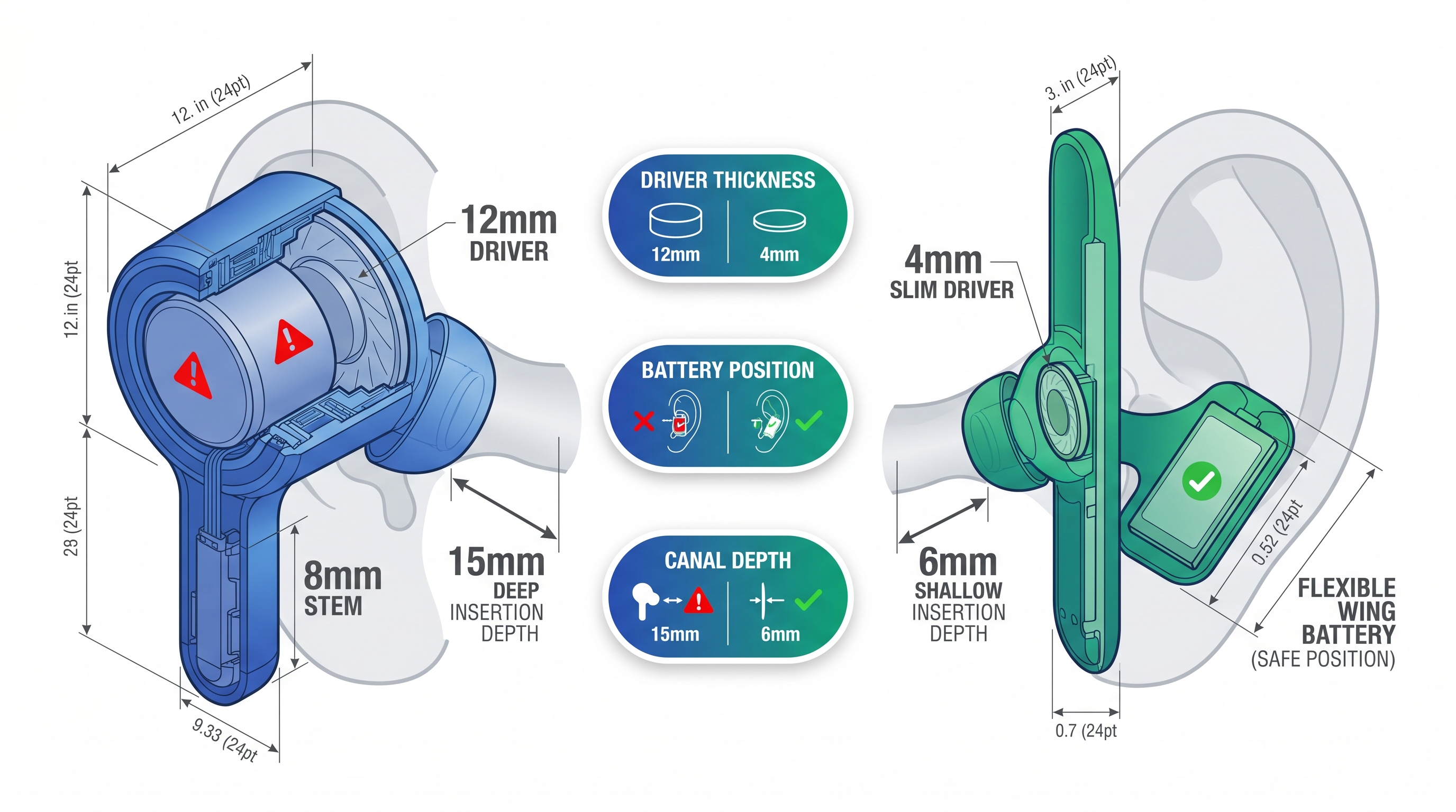 - Photos: Side-view overlays showing the bud flush with the ear vs. protruding competitors.