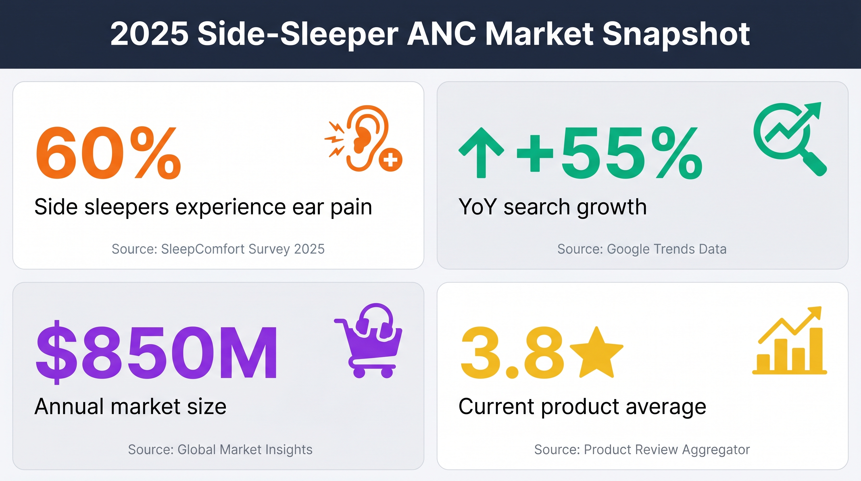 - Search volume: "Earbuds for side sleepers" up 55% YoY.