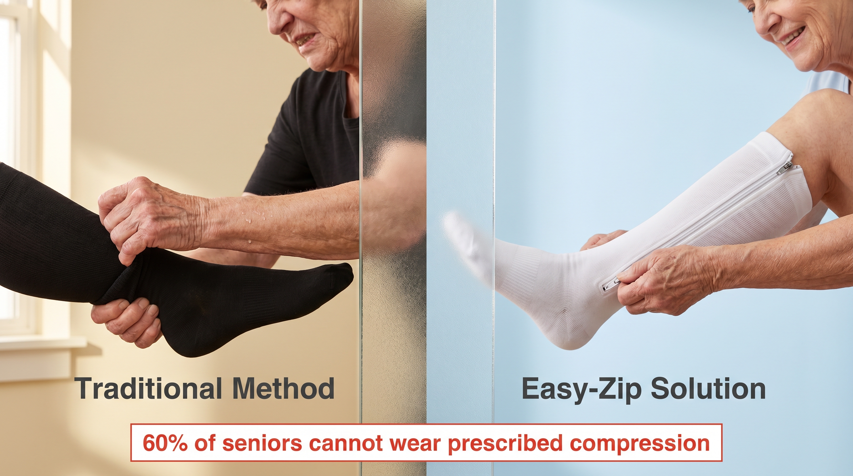 - Photos: Side-by-side comparison of a hand struggling with a standard sock vs. a zip-up.
