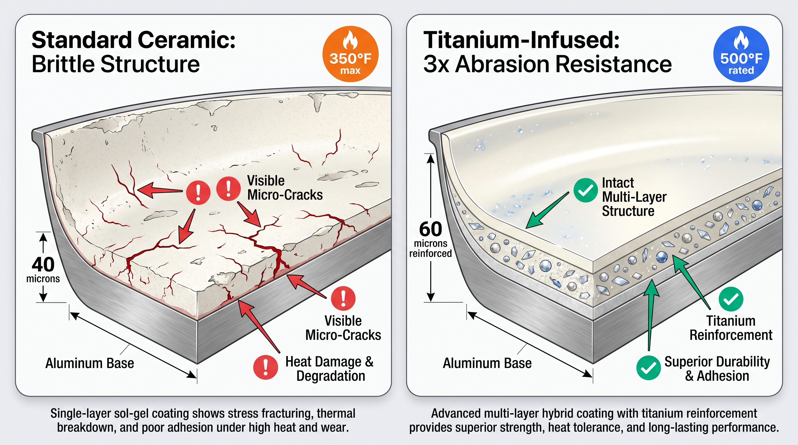- Why current products fail: Ceramic coatings are inherently more brittle and less heat-tolerant than traditional PTFE.