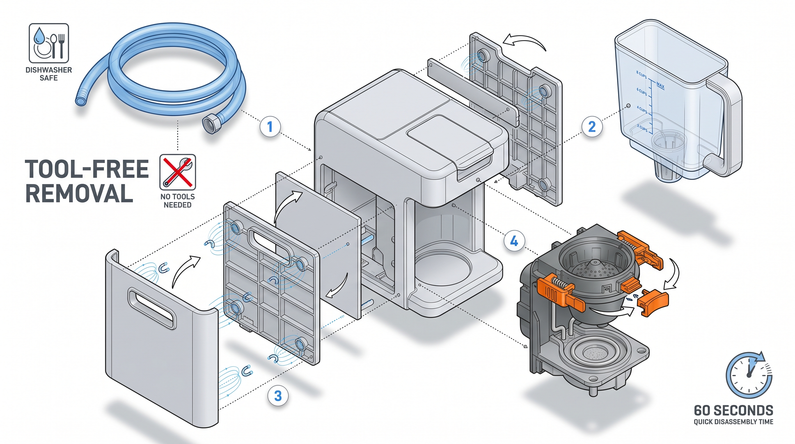 - Key features: Magnetic-latch external panels, tool-free hose removal, dishwasher-safe water paths.