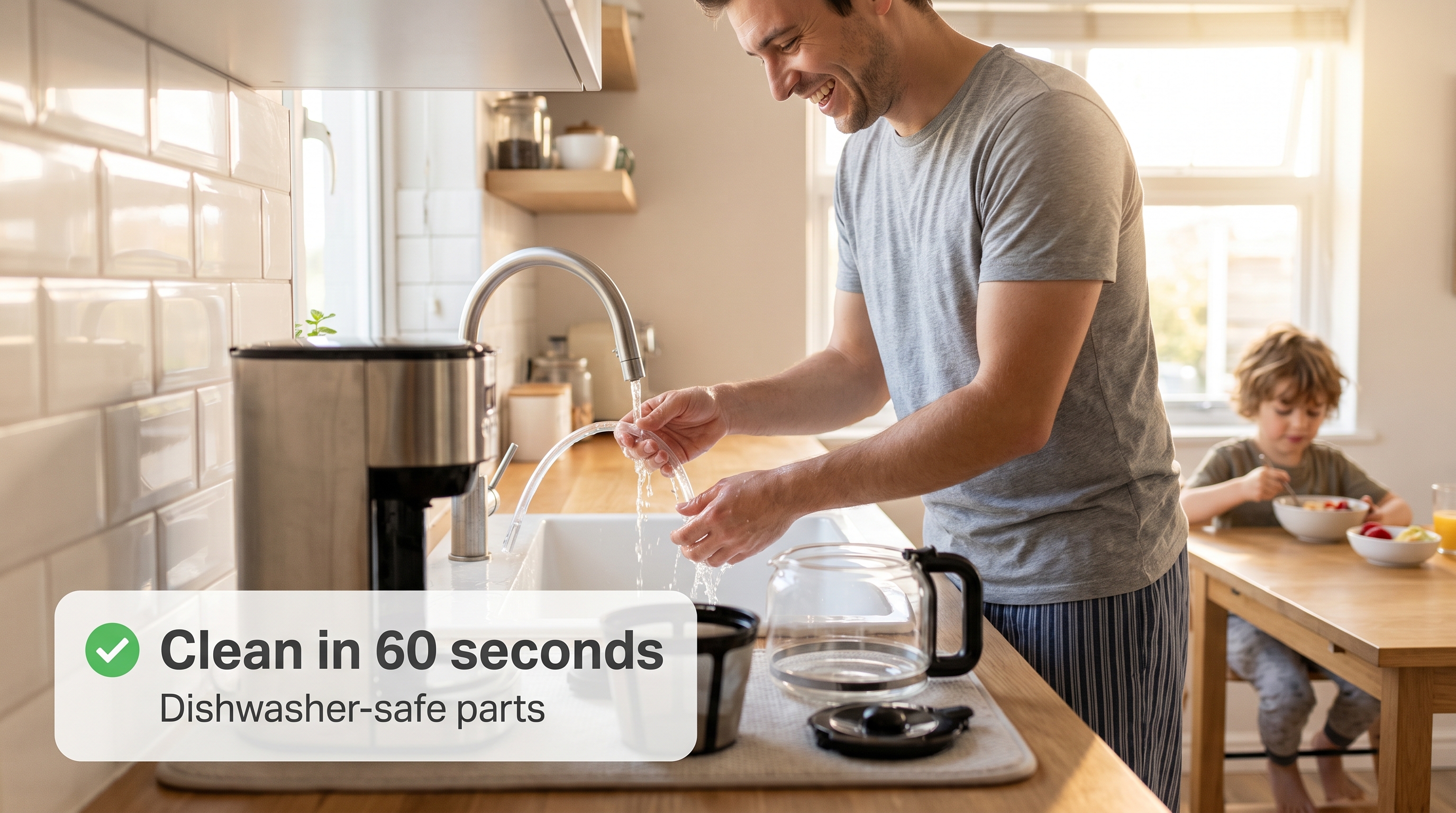 - Photo strategy: Parent quickly snapping the machine apart for cleaning.