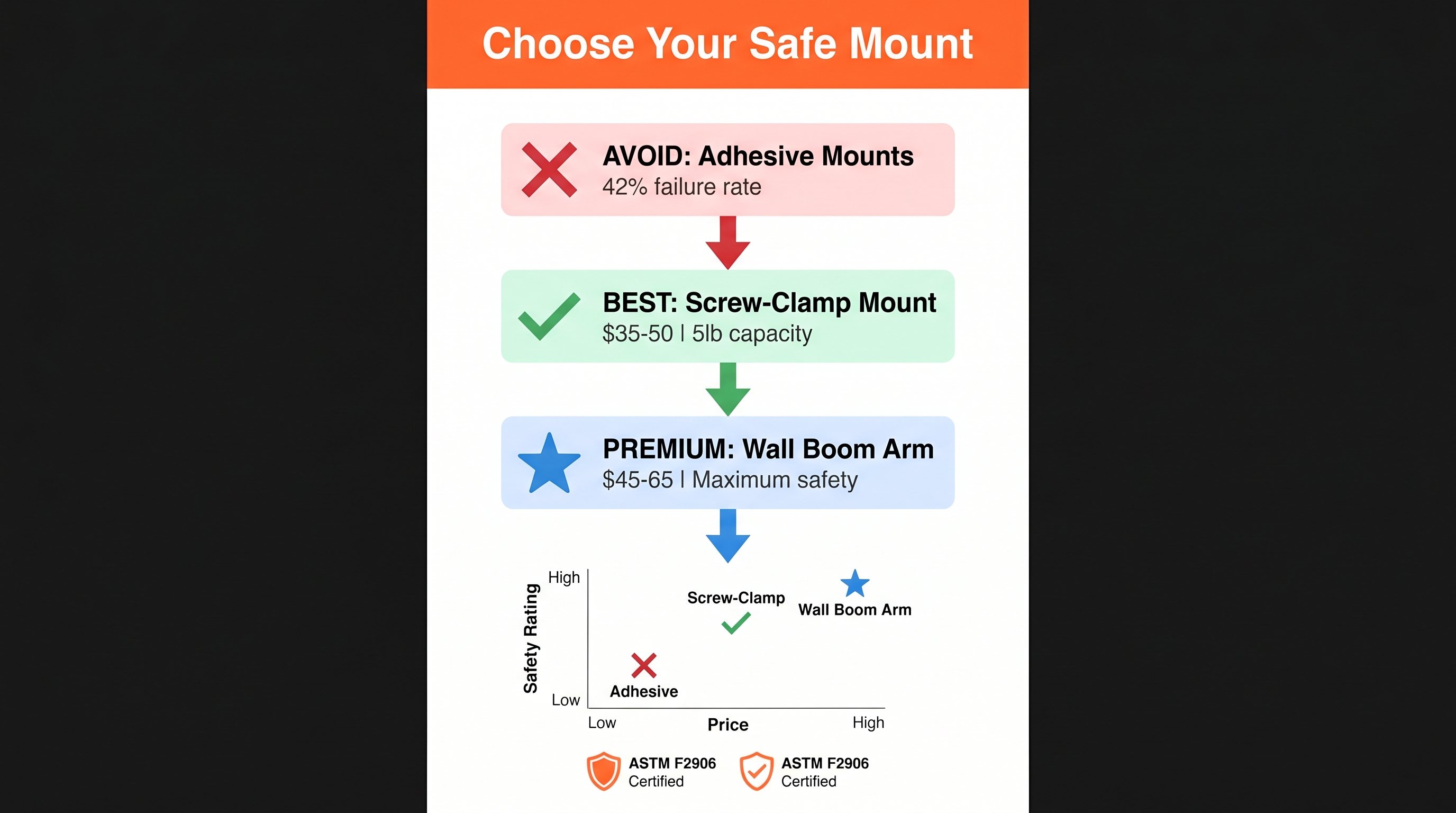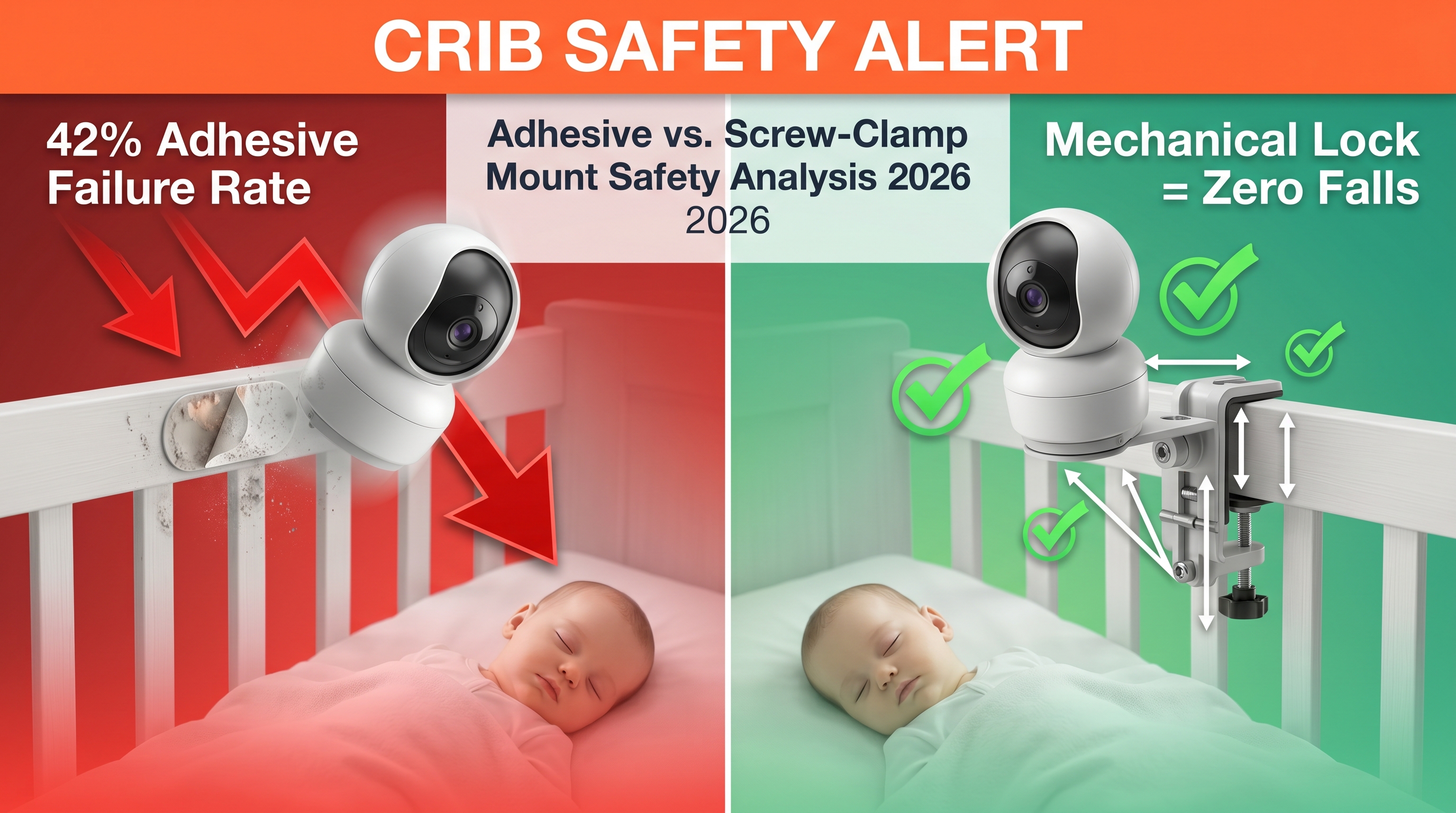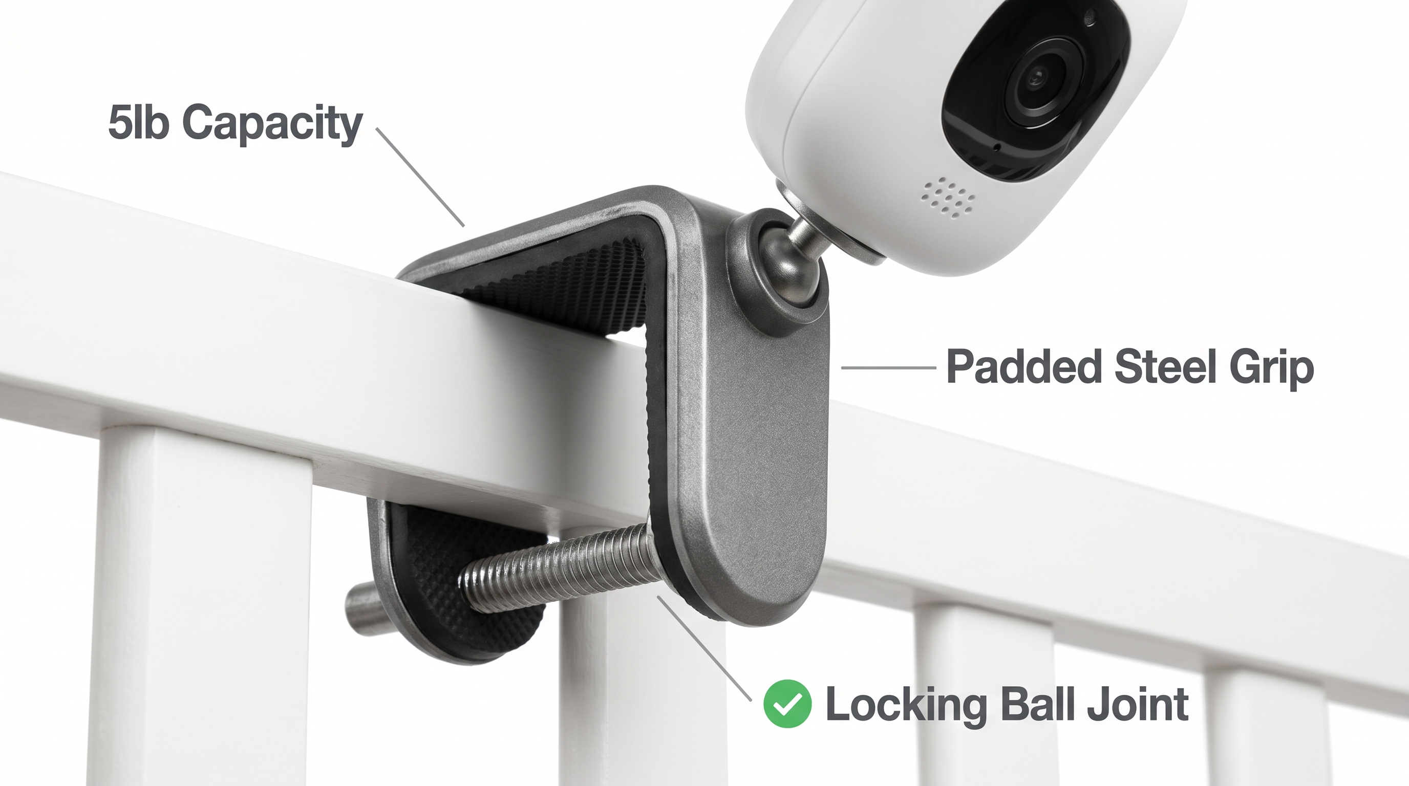 Parents are terrified by the failure of standard adhesive clips and universal twist mounts. High-end cameras like Nanit and Owlet are too heavy for cheap plastic mounts. Over time, heat and humidity cause adhesives to peel, while flexible "gooseneck" mounts sag, eventually dropping the heavy device into the crib. This creates immediate risks of blunt force trauma or cord strangulation.