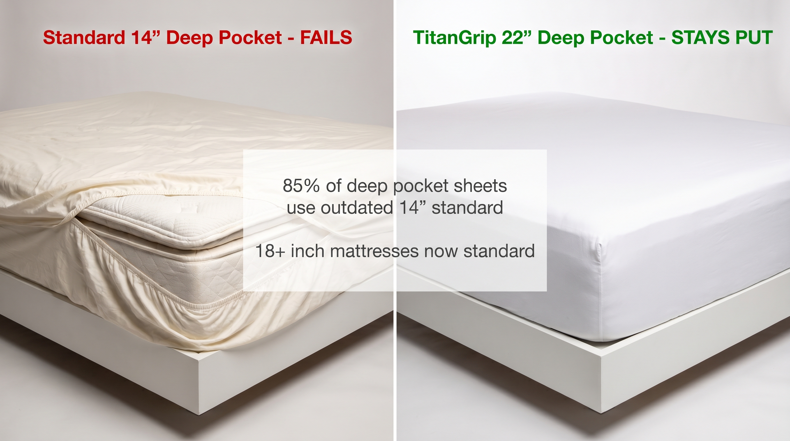 While mattresses have grown to 18+ inches in depth, 85% of "deep pocket" sheets still use a 14-inch standard, causing nightly slippage.