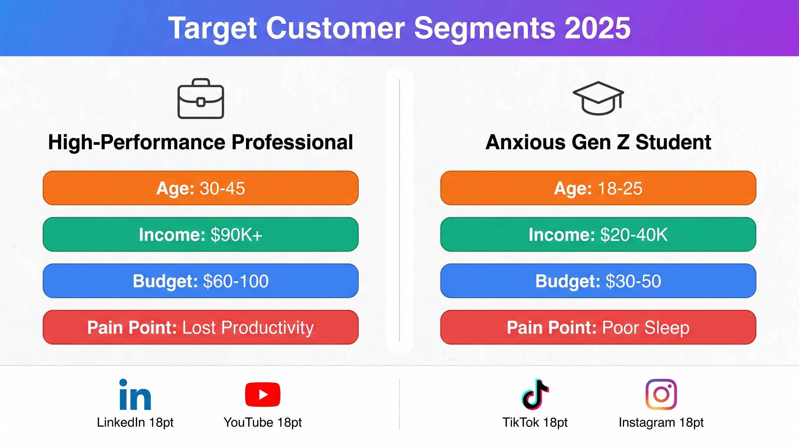 - Demographics: Age 18-25, Income $20-40K, University Students