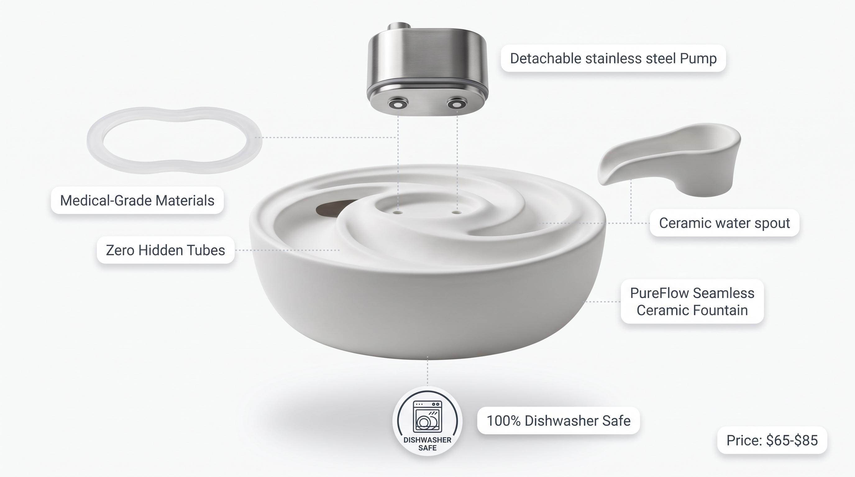 Product Solution 1: The "PureFlow" Seamless Ceramic Fountain