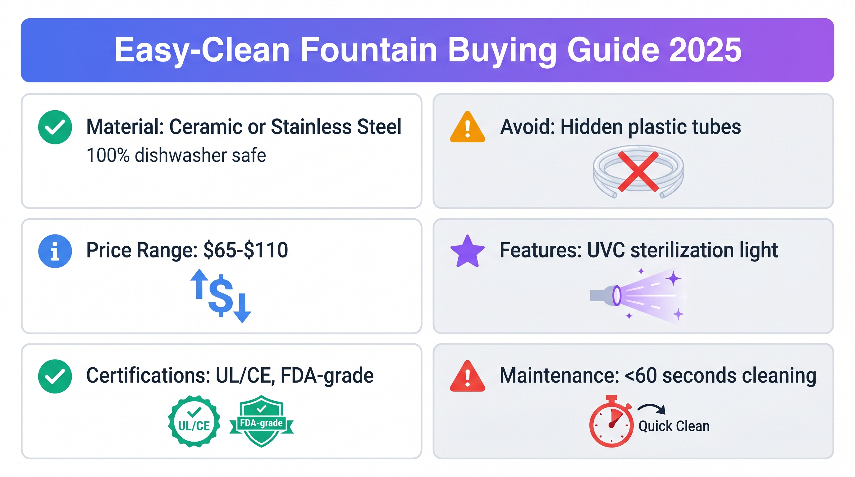 - Key features: 100% dishwasher-safe ceramic, open-channel water flow (no tubes), detachable stainless steel pump.