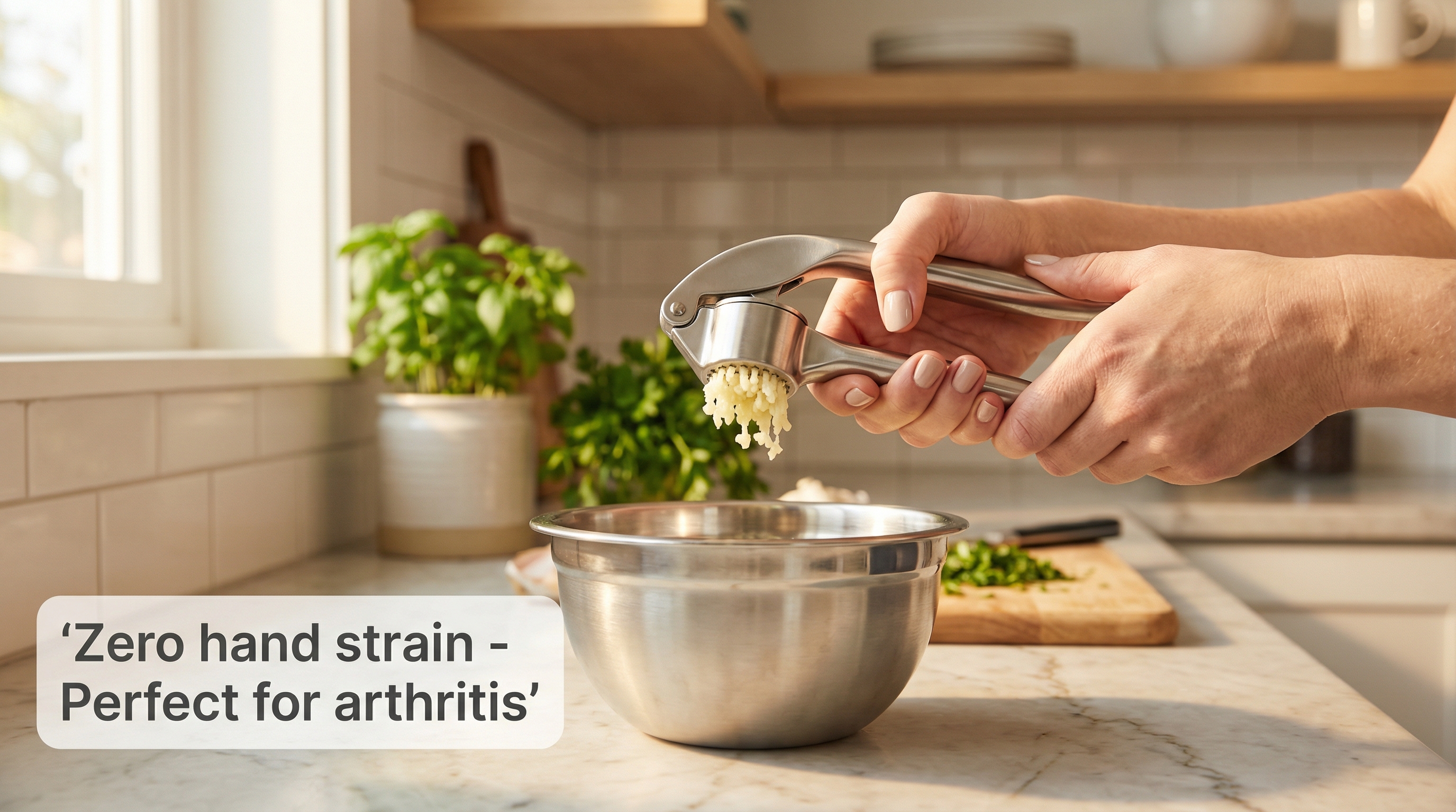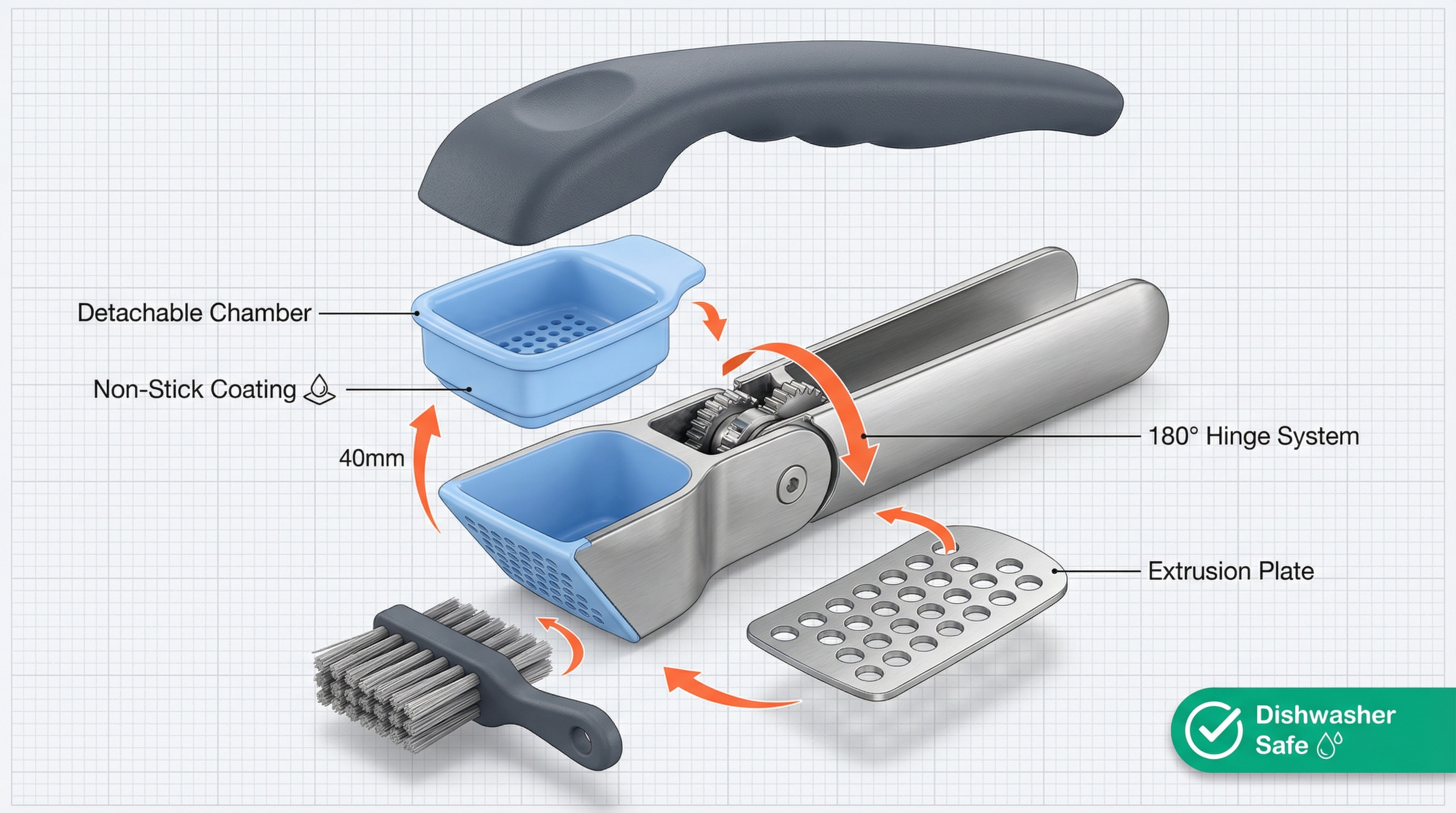 Users on platforms like Reddit are frustrated with traditional "rocker" and "press" tools. These tools are inefficient and hard to maintain. A major concern is "garlic waste." Roughly 50% of the clove remains trapped in the extrusion holes. Even high-end models fail in dishwashers. Users must manually poke out residue with toothpicks. This is a huge barrier for users with limited fine motor skills.