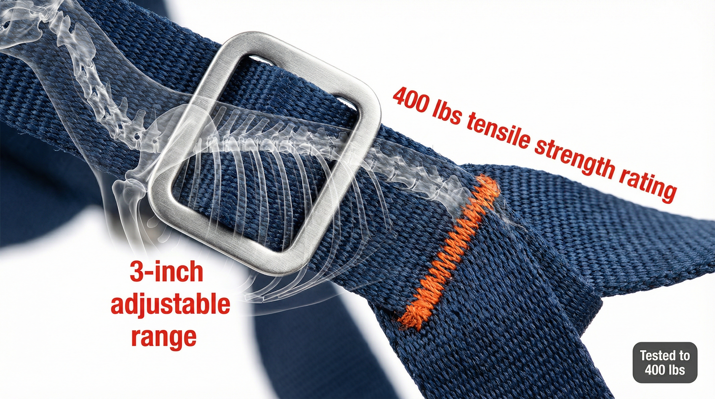 - Solves: Prevents "backing out" by securing the harness behind the widest part of the ribcage.