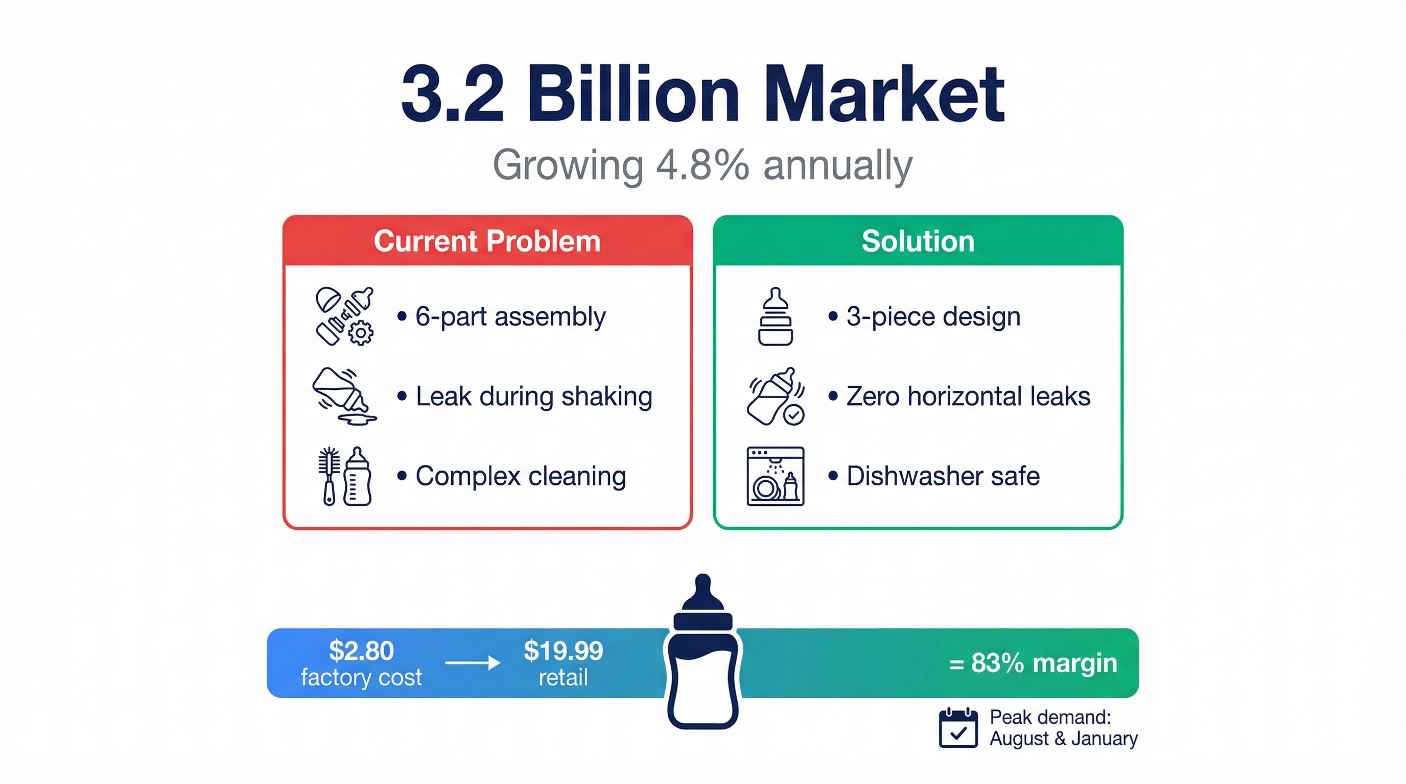 - Pain point: Bottles leaking during daycare drop-off.