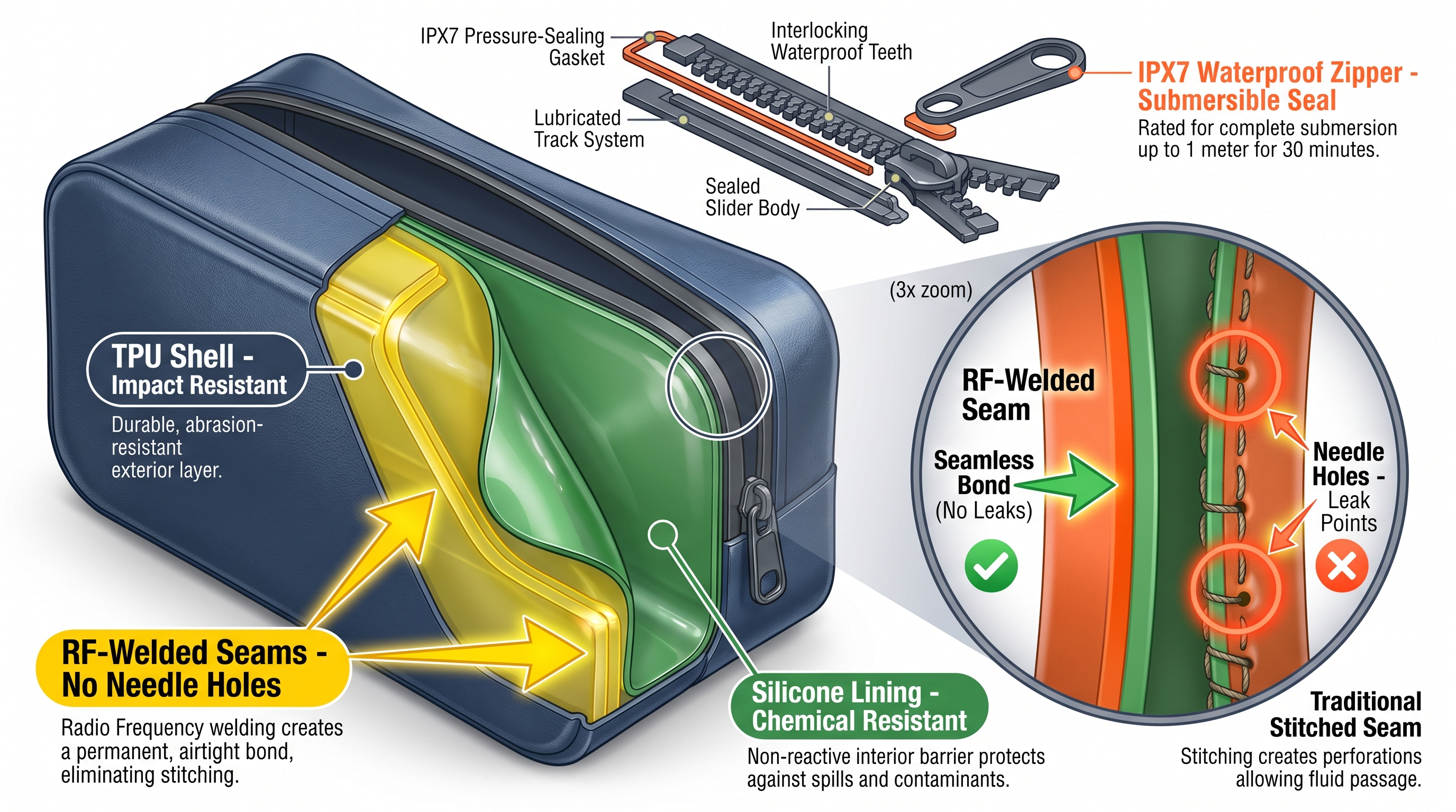 Frequent flyers are tired of "water-resistant" bags that fail at the seams during cabin pressure changes. Standard PVC and nylon bags leak shampoo directly into suitcases, permanently staining clothes and leather goods.