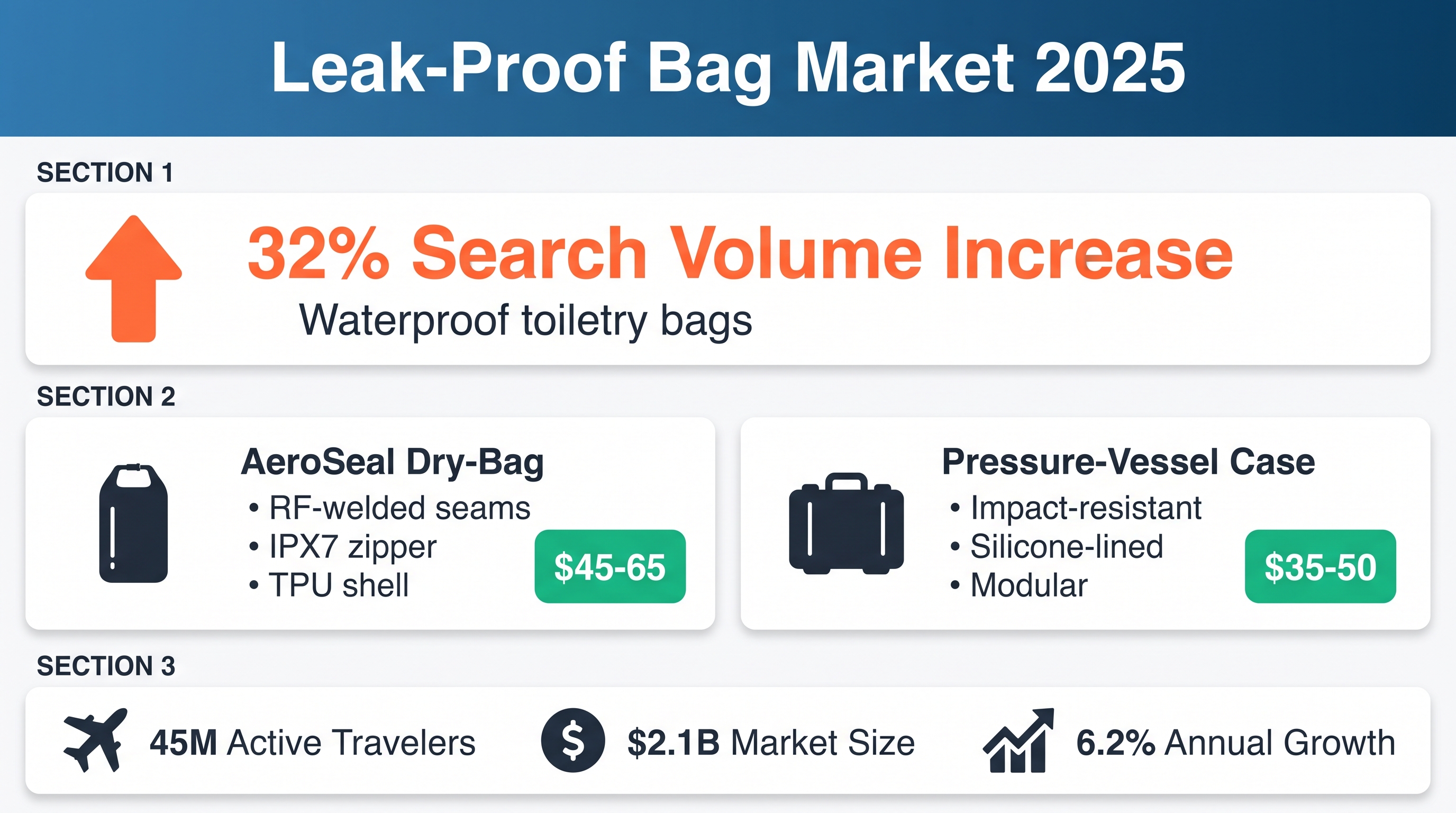 - Search volume: "Waterproof toiletry bag" trending up 32% in past 12 months.