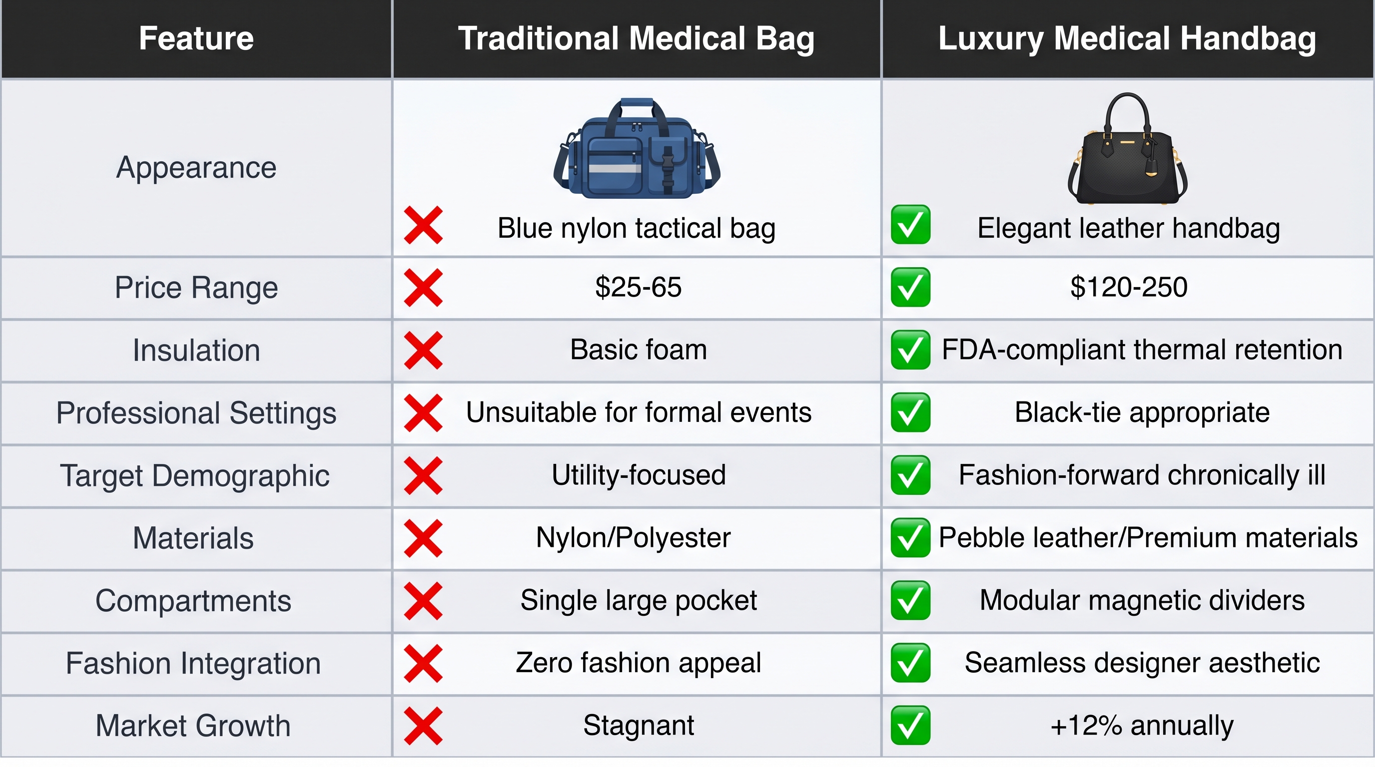 - Better than existing: Looks like a premium designer bag but functions as a medical cooler.