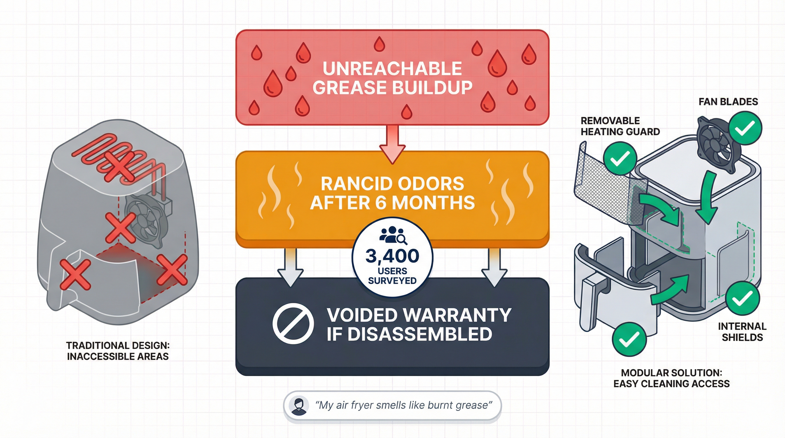 • Common complaint: "My air fryer smells like burnt grease every time I turn it on, but I can't reach the fan to scrub it."
