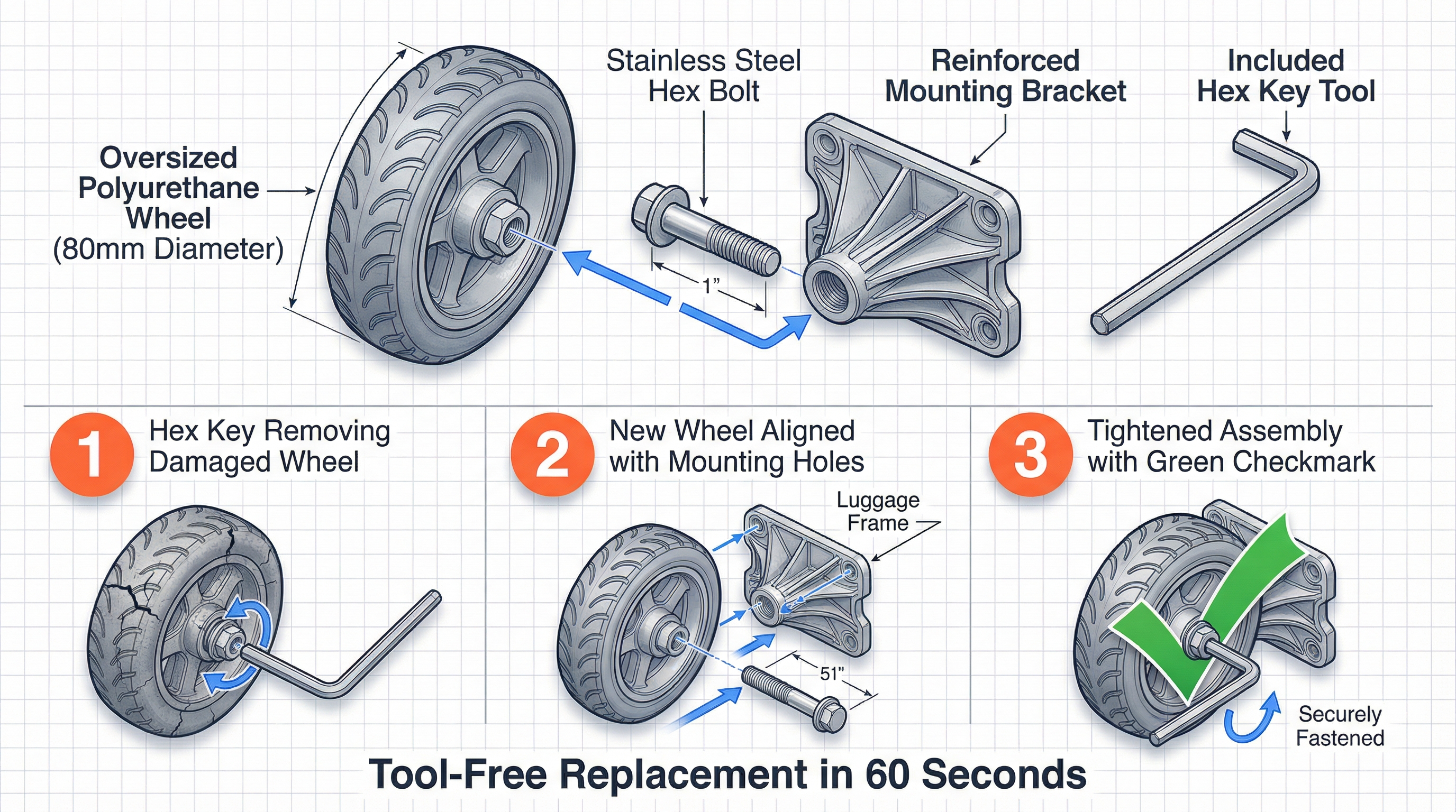 - Better than existing: Includes a small hex key and two spare wheels inside the lining for instant repairs.