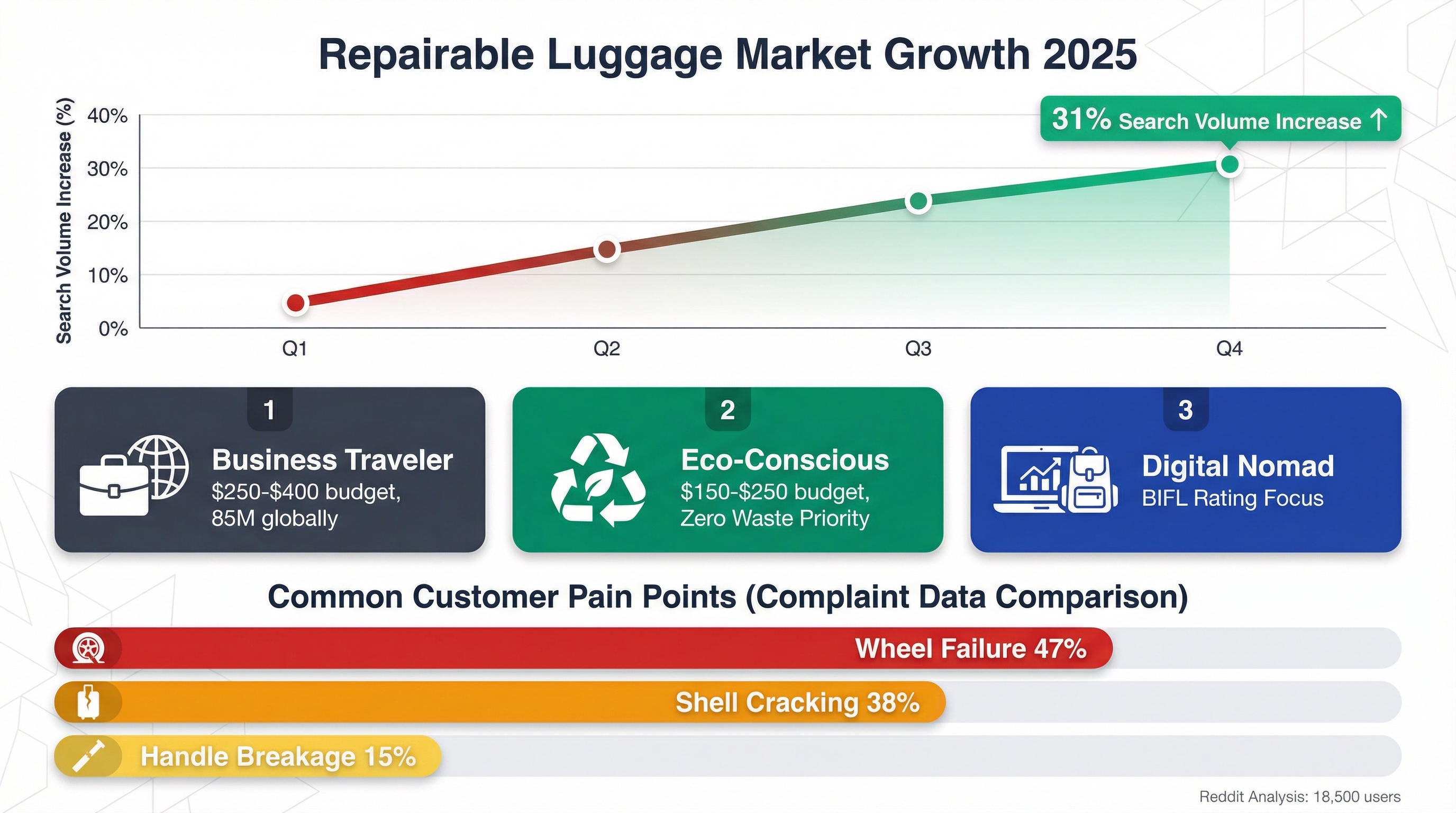 - Search volume: "Repairable luggage" trending up 31% in past 12 months.