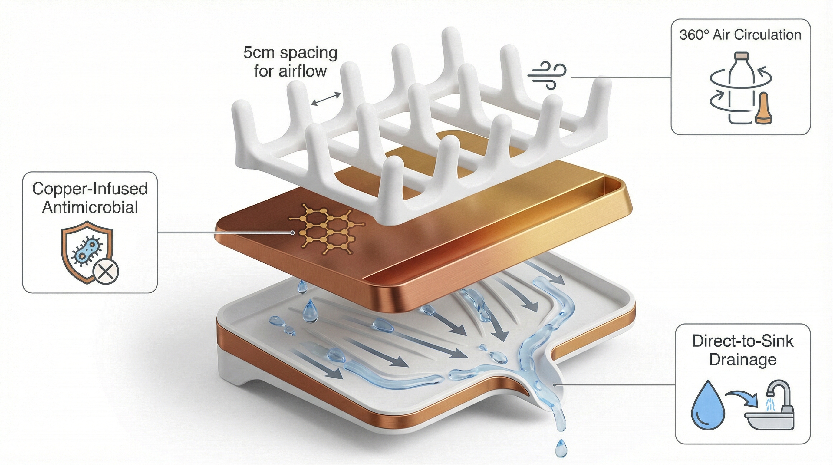 • Key features: Copper-infused plastic, wide-spaced pegs, direct-to-sink spout.