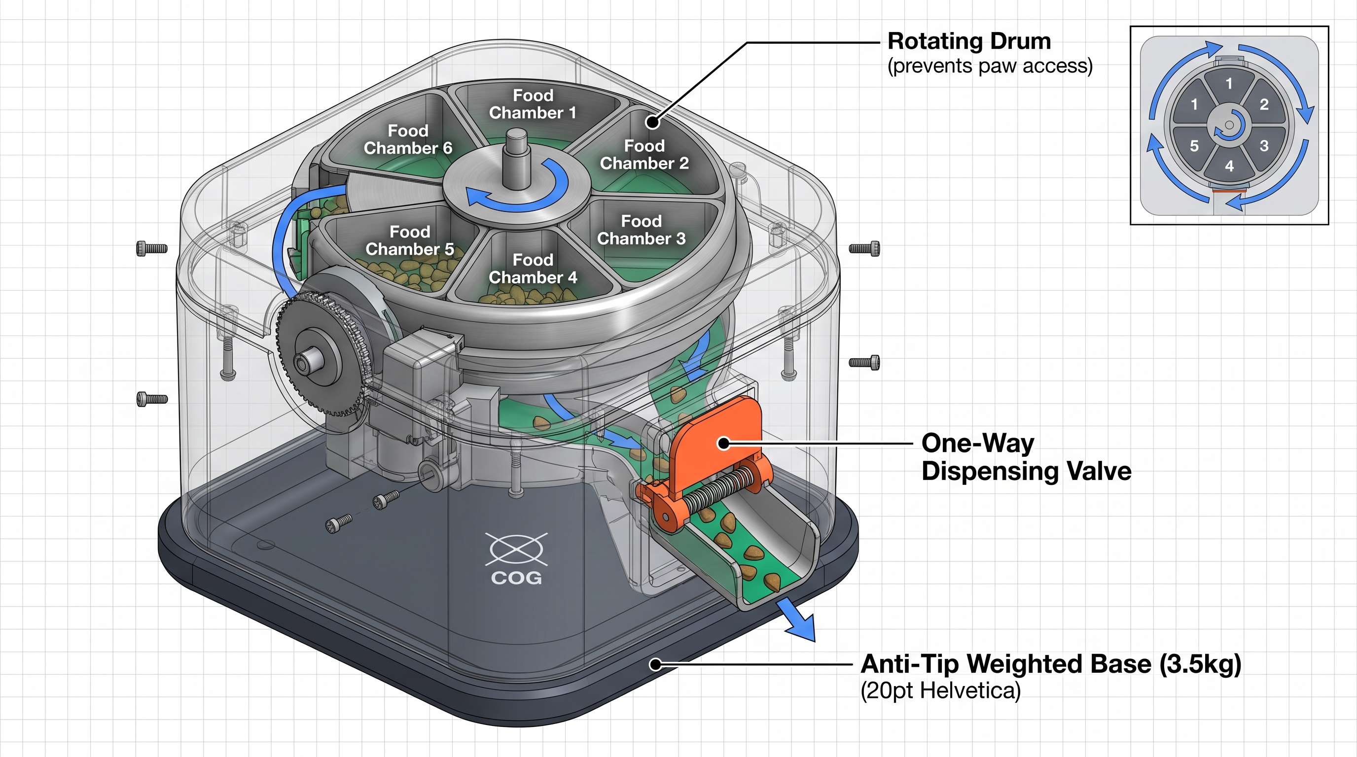 - Better than existing: Replaces the open gravity chute with a rotating compartment that only exposes food during the active dispensing cycle.