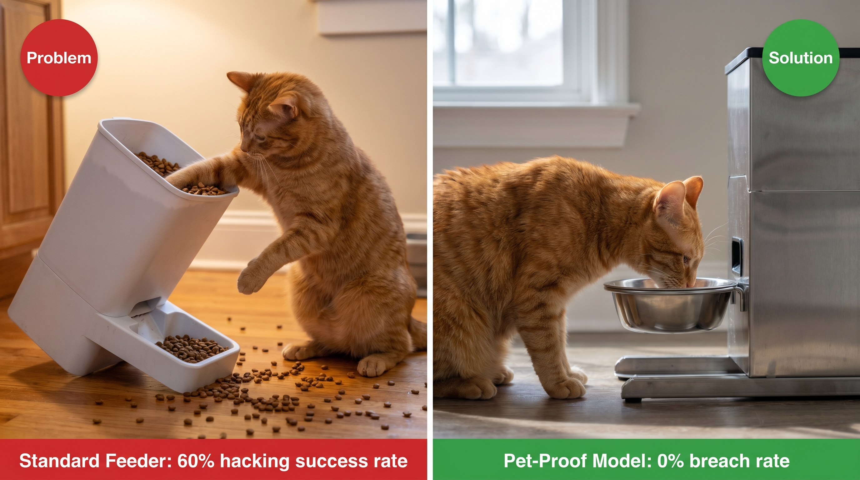 Owners of food-motivated cats are venting on Reddit about clever pets bypassing dispenser chutes. Cats insert their paws into the mechanism to dislodge kibble or knock the feeder over to pop the lid. Current "smart" feeders prioritize WiFi connectivity and app features but ignore basic physical security. This results in feline overeating, weight management failures, and expensive devices being destroyed by persistent animals.