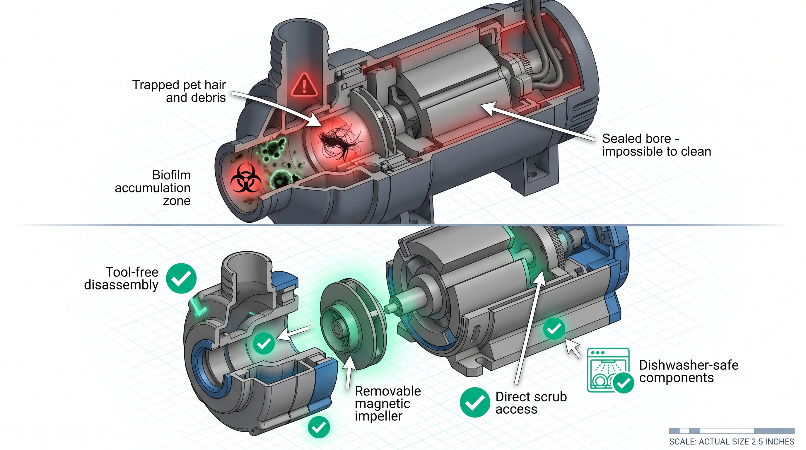 Pet owners on platforms like Reddit are expressing deep frustration with "sealed" submersible pumps. These generic components trap hair, mold, and bacteria in inaccessible internal chambers. Owners of brands like Catit and PetSafe report that even with weekly cleaning, the pumps become "slime magnets" that are impossible to fully sanitize. This design flaw forces users to choose between risking their pet's health or frequently discarding entire units.