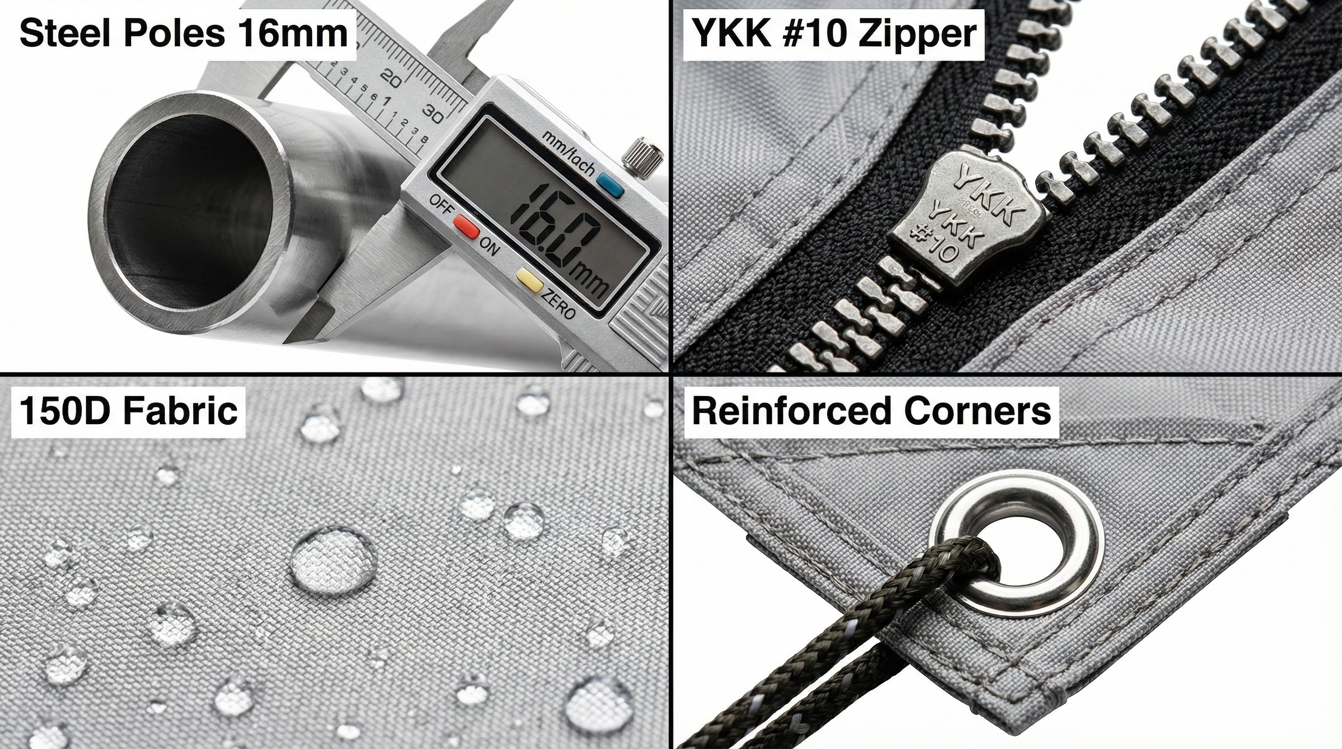 - Key features: 16mm oversized steel poles, YKK #10 zippers, 150D Oxford fabric.