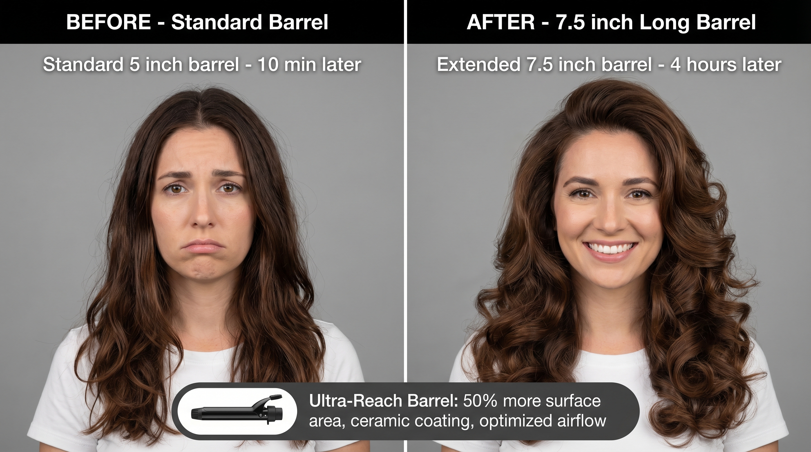 - Message: "Cut your styling time in half with extended barrels."