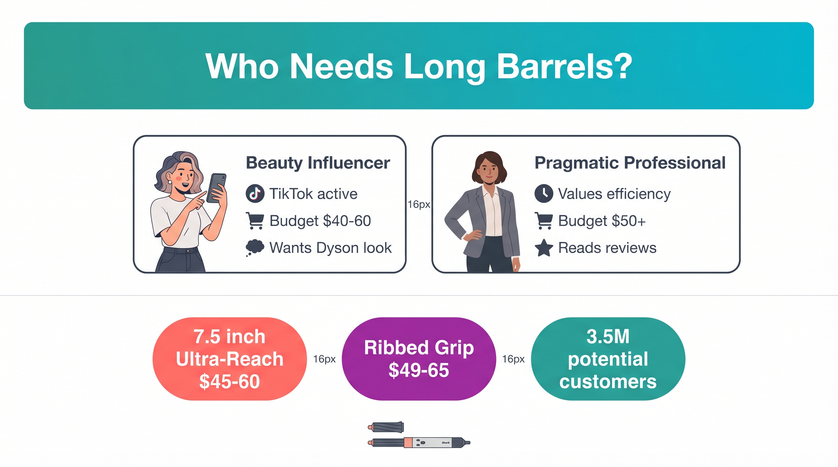 - Pain point: Styling takes 45 minutes because the barrels are too small