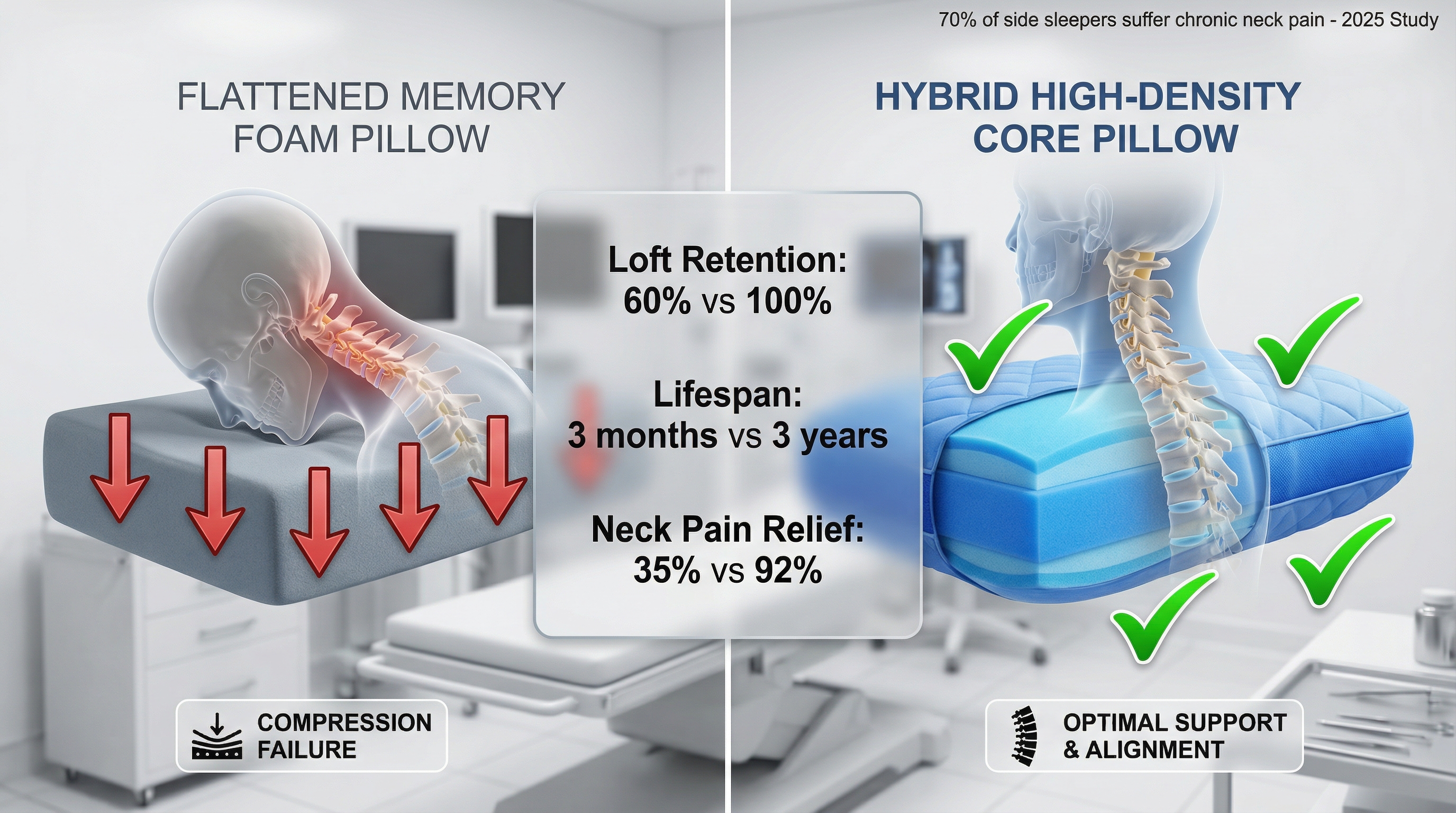 Chronic neck pain affects 70% of side sleepers who report that "premium" memory foam pillows lose 40% of their loft within the first 90 days of use.