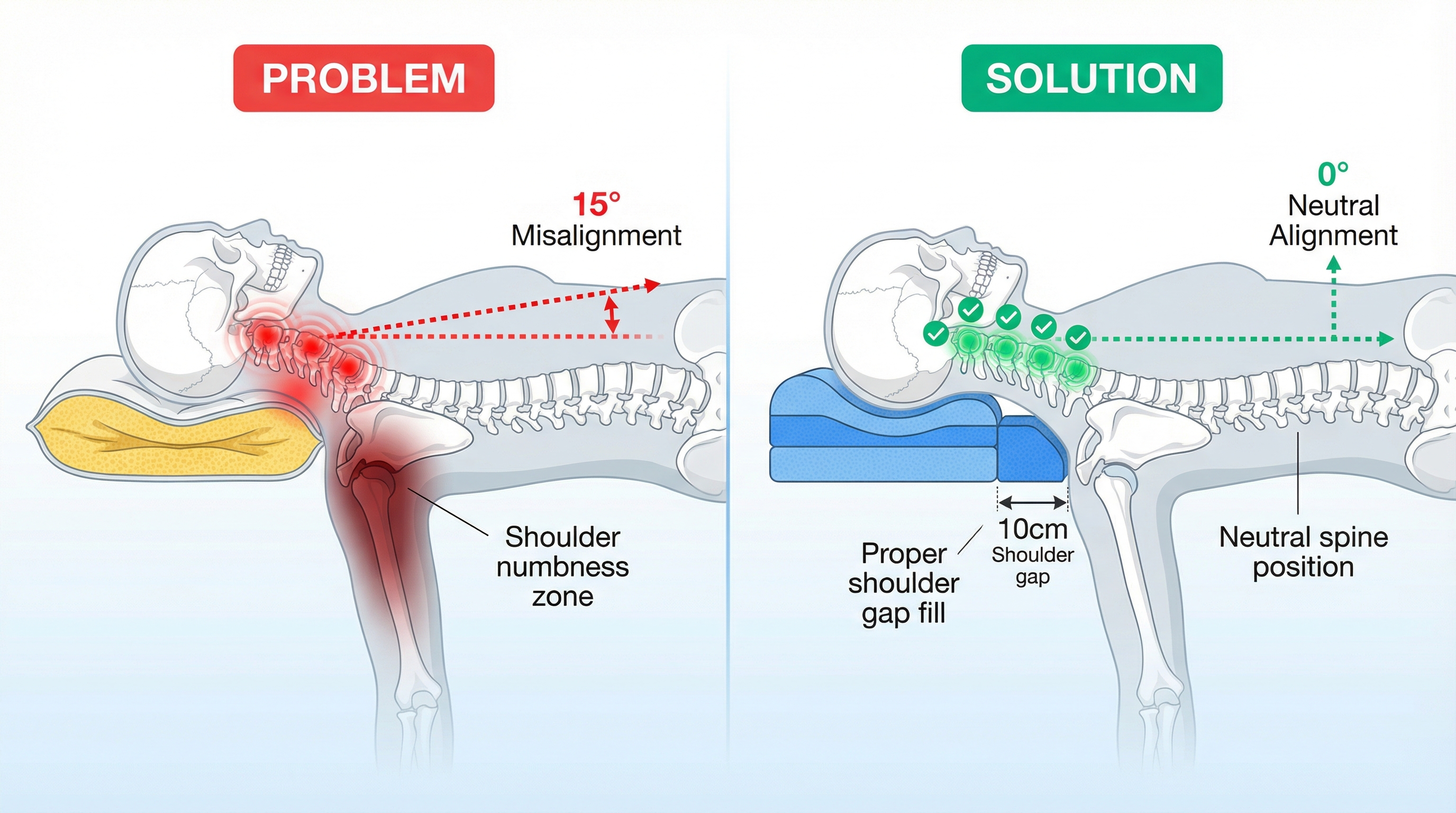 Over 70% of side sleepers experience chronic neck pain because standard pillows collapse and fail to support the critical shoulder gap.