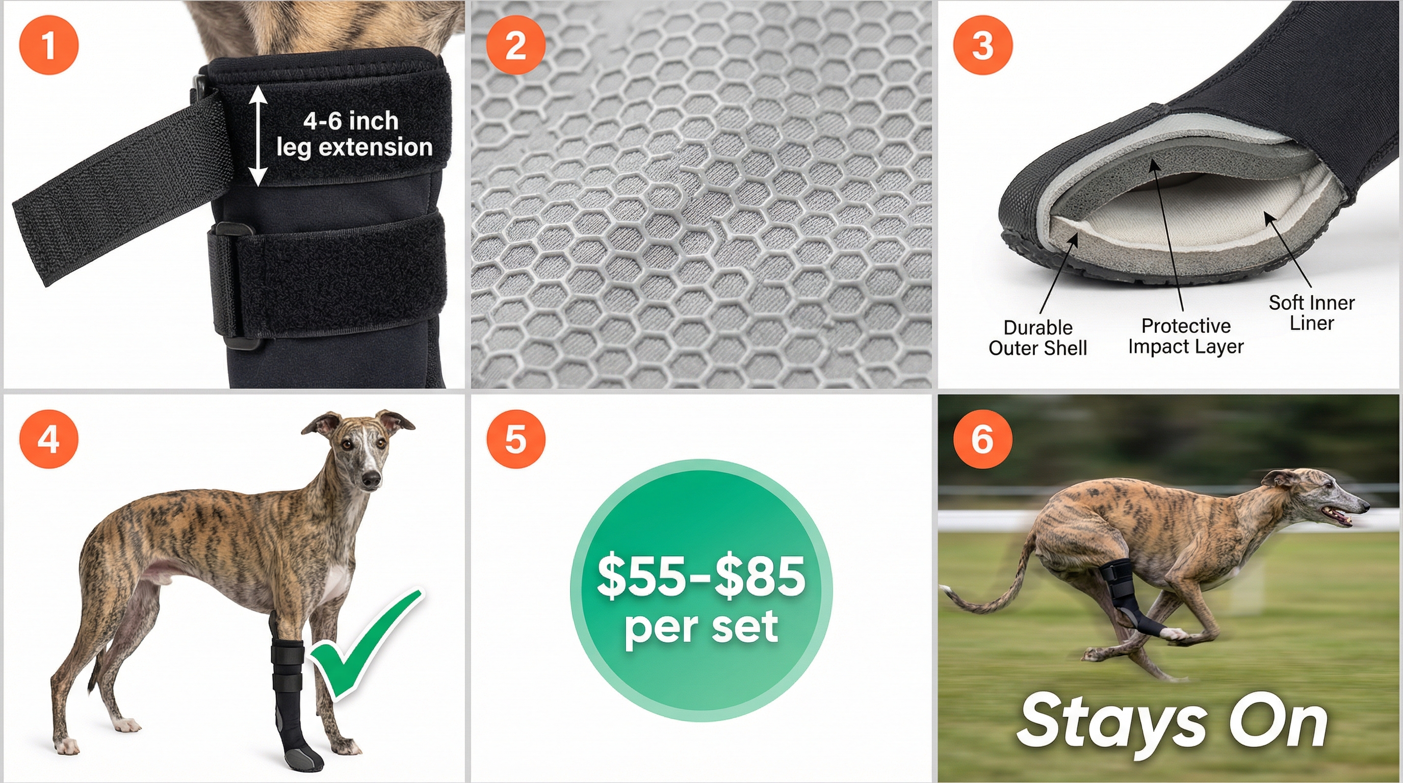 • Better than existing: Specifically patterned for sighthound anatomy, extending 4-6 inches up the leg for stability.
