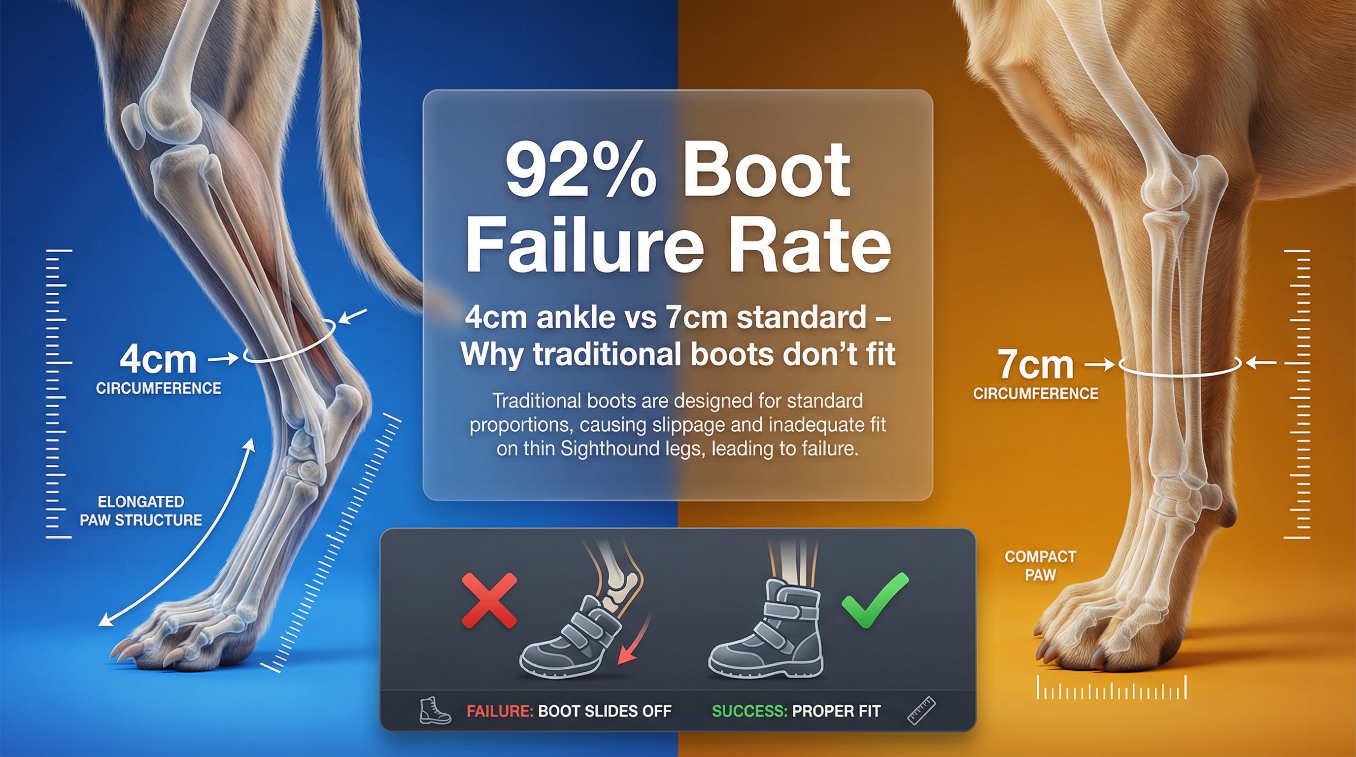 • Standard dog boots fail 92% of sighthounds due to a biological mismatch between thin ankles and large paws.
