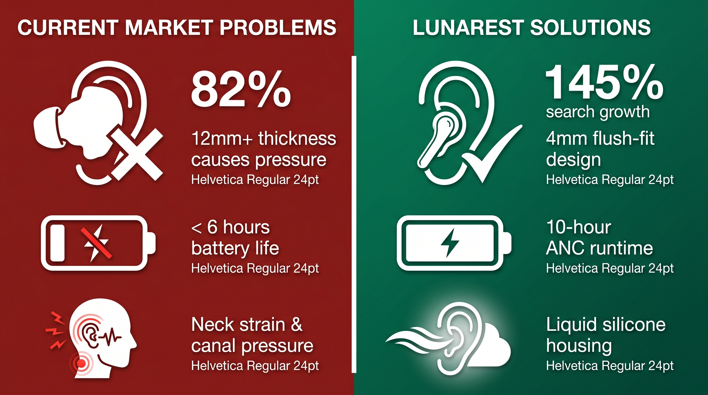 Over 45% of urban apartment dwellers report using headphones to block city noise, yet 82% find current market leaders physically painful for side-sleeping.
