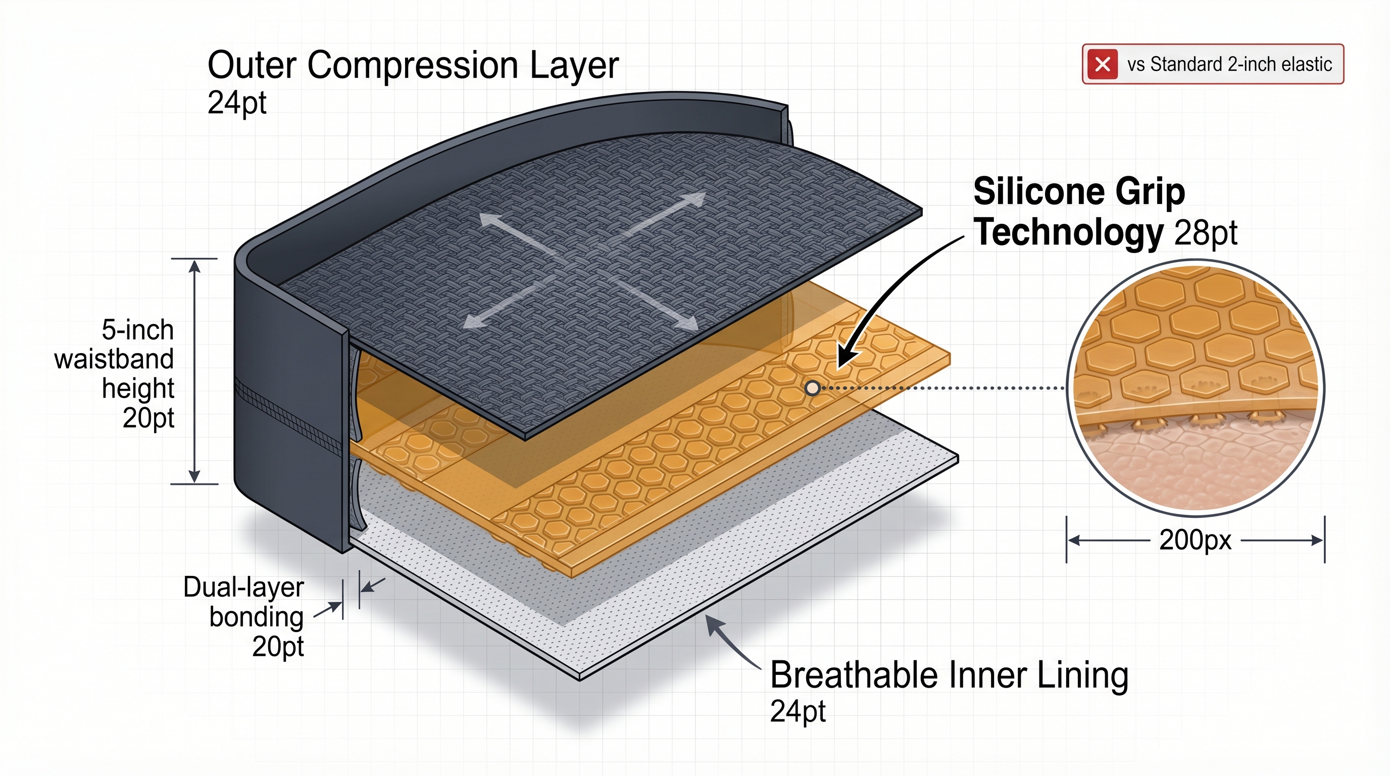 - Why current products fail: Thin elastic bands lack the vertical rigidity needed to resist rolling during intense torso movement.