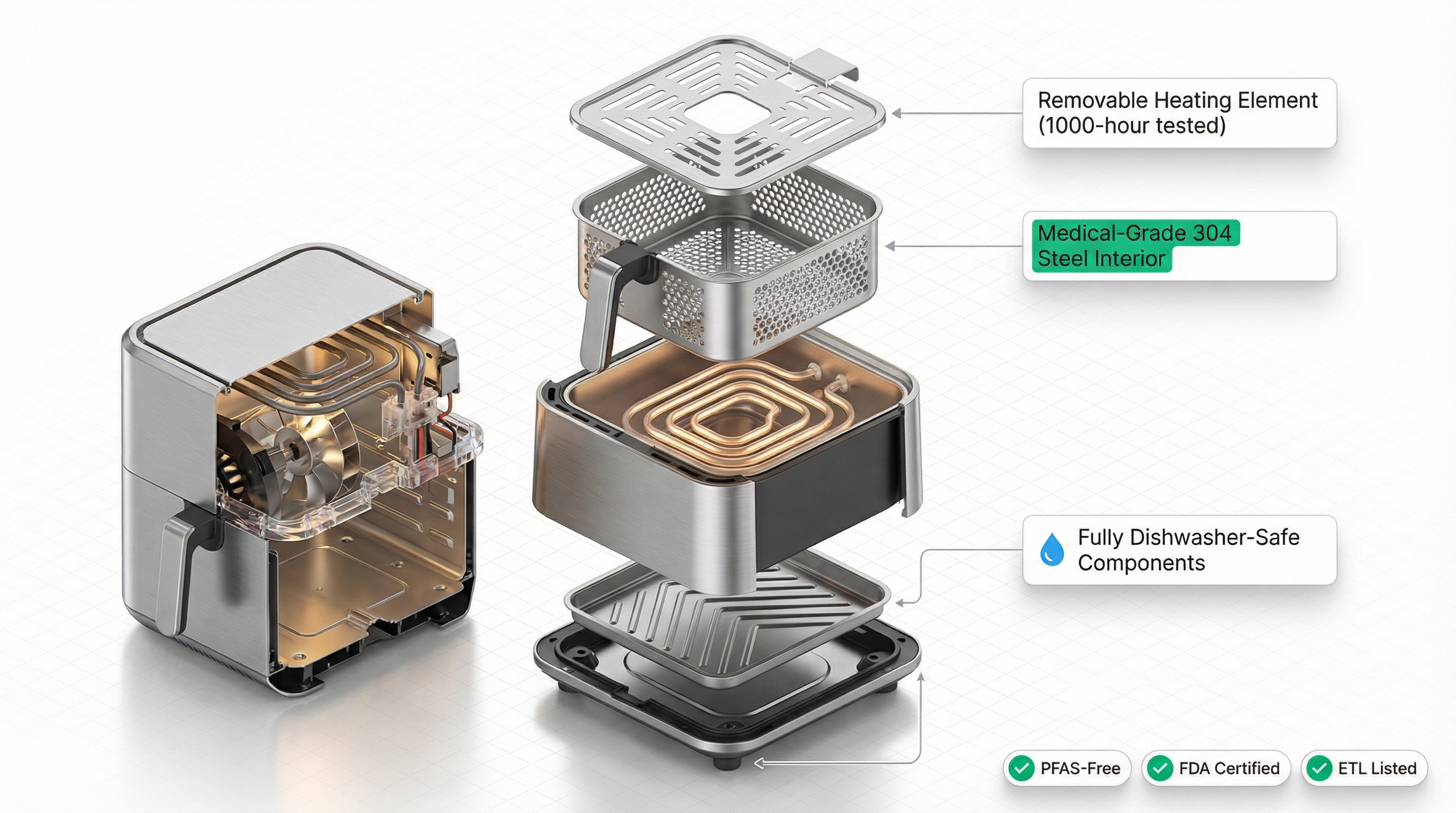 - Key features: 304-grade stainless steel interior, fully removable heating element guard, dishwasher-safe modular chassis.