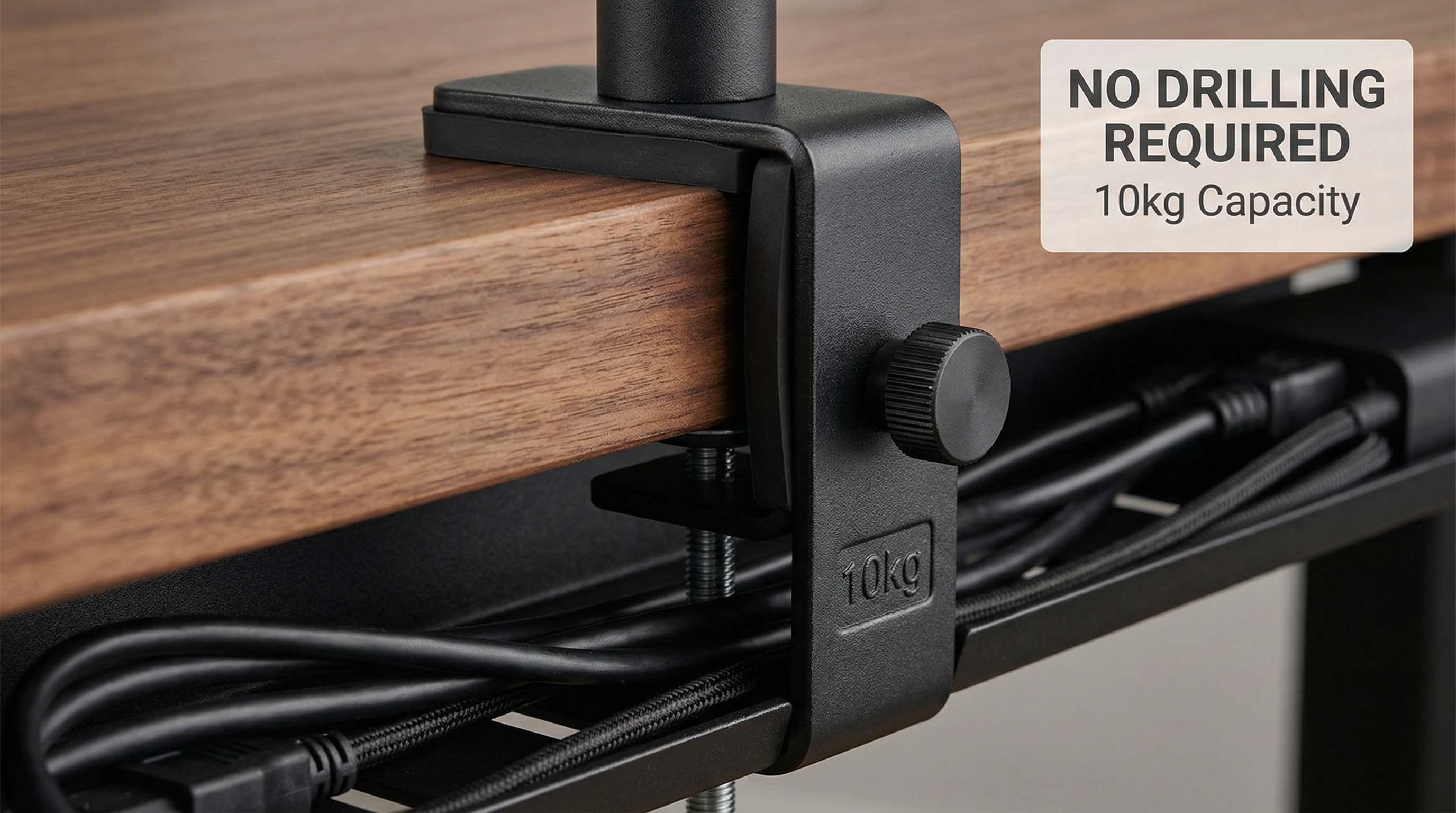 • Key features: Padded C-clamps, 10kg weight capacity, integrated power strip housing.