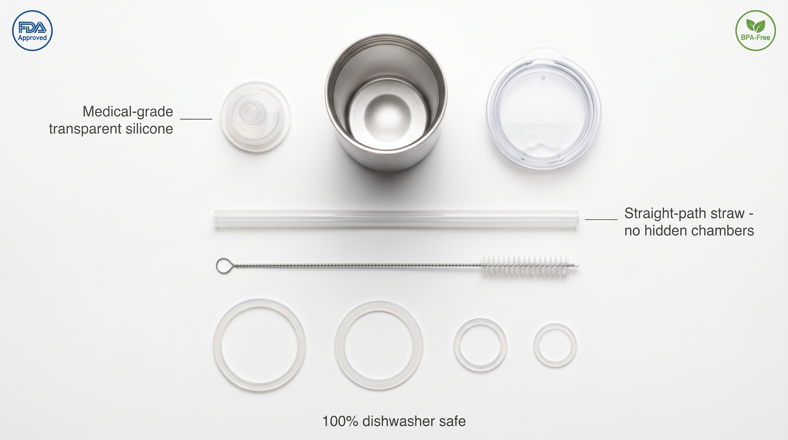 - Key features: Transparent medical-grade silicone valves, 100% straight-path straws, and wide-mouth stainless steel body.