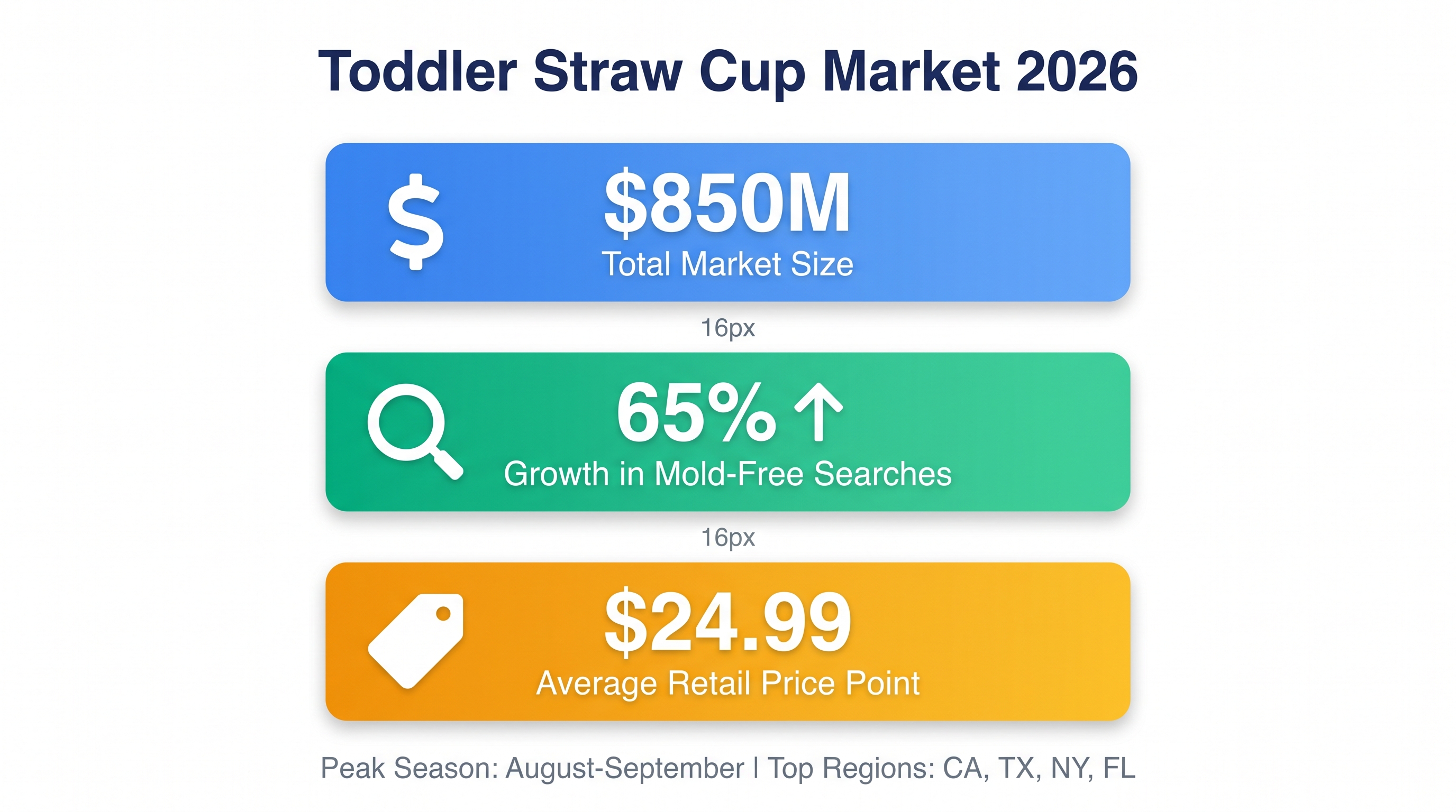 - Search volume: "Mold-free toddler cup" trending up 65% in the past 12 months.