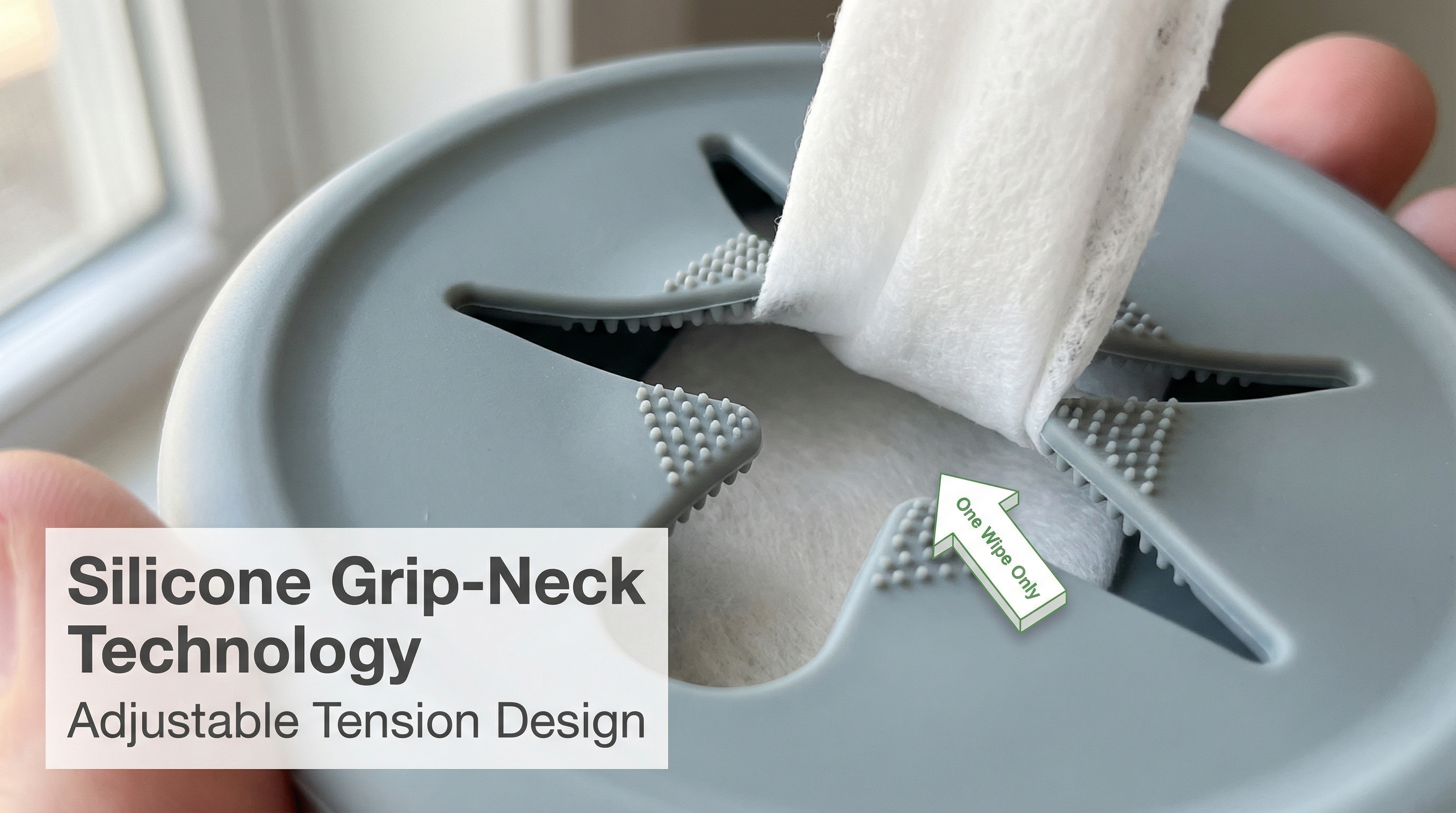 - Solves: Uses a high-friction silicone star-shaped aperture to snag the second wipe.