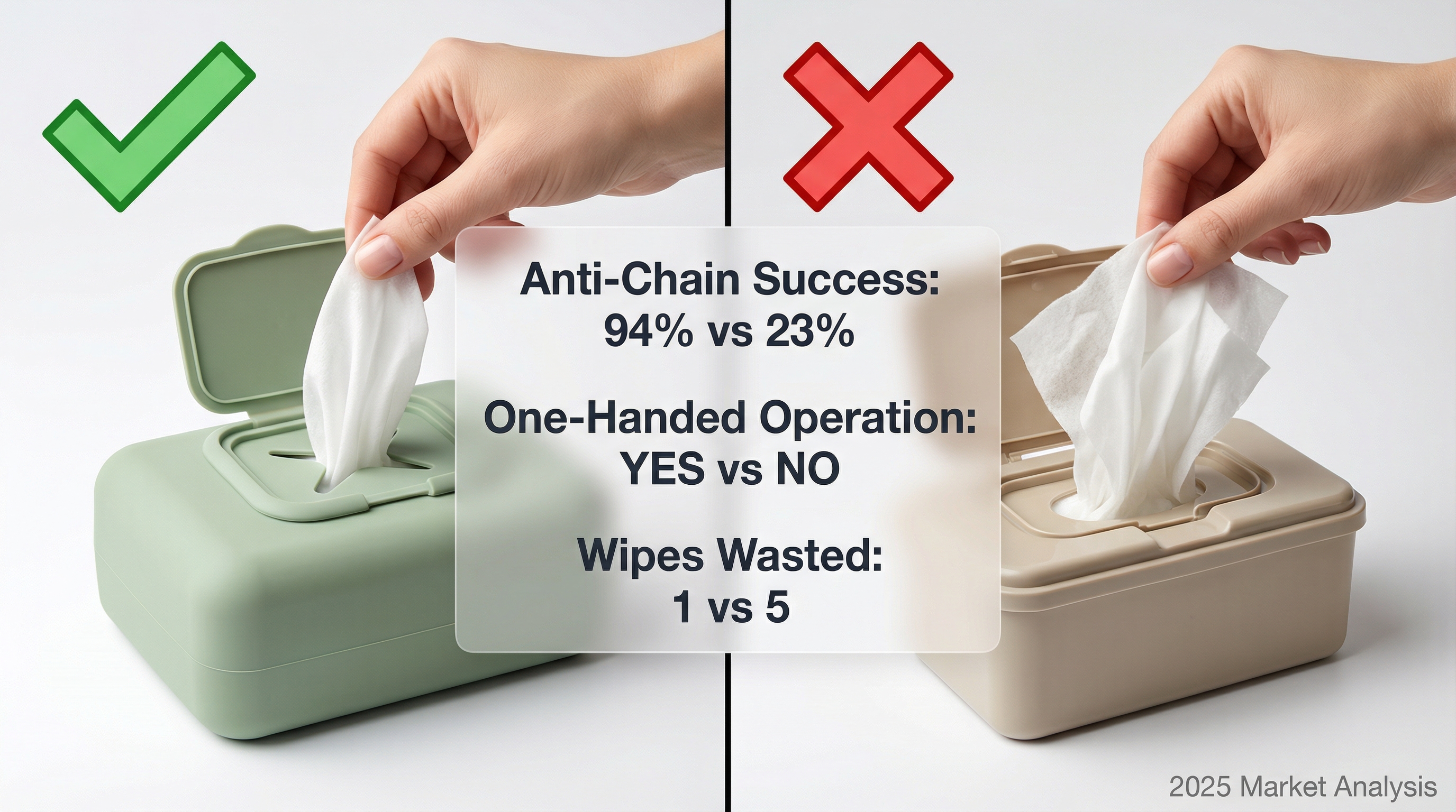 The primary frustration stems from the 'chaining' effect of wet wipe packaging. Pulling one wipe causes several others to follow, often stuck together. This leads to product waste and complicates tasks like diaper changes. Parents frequently operate with only one hand while securing a child. Existing travel bags lack a built-in mechanism to separate wipes reliably.
