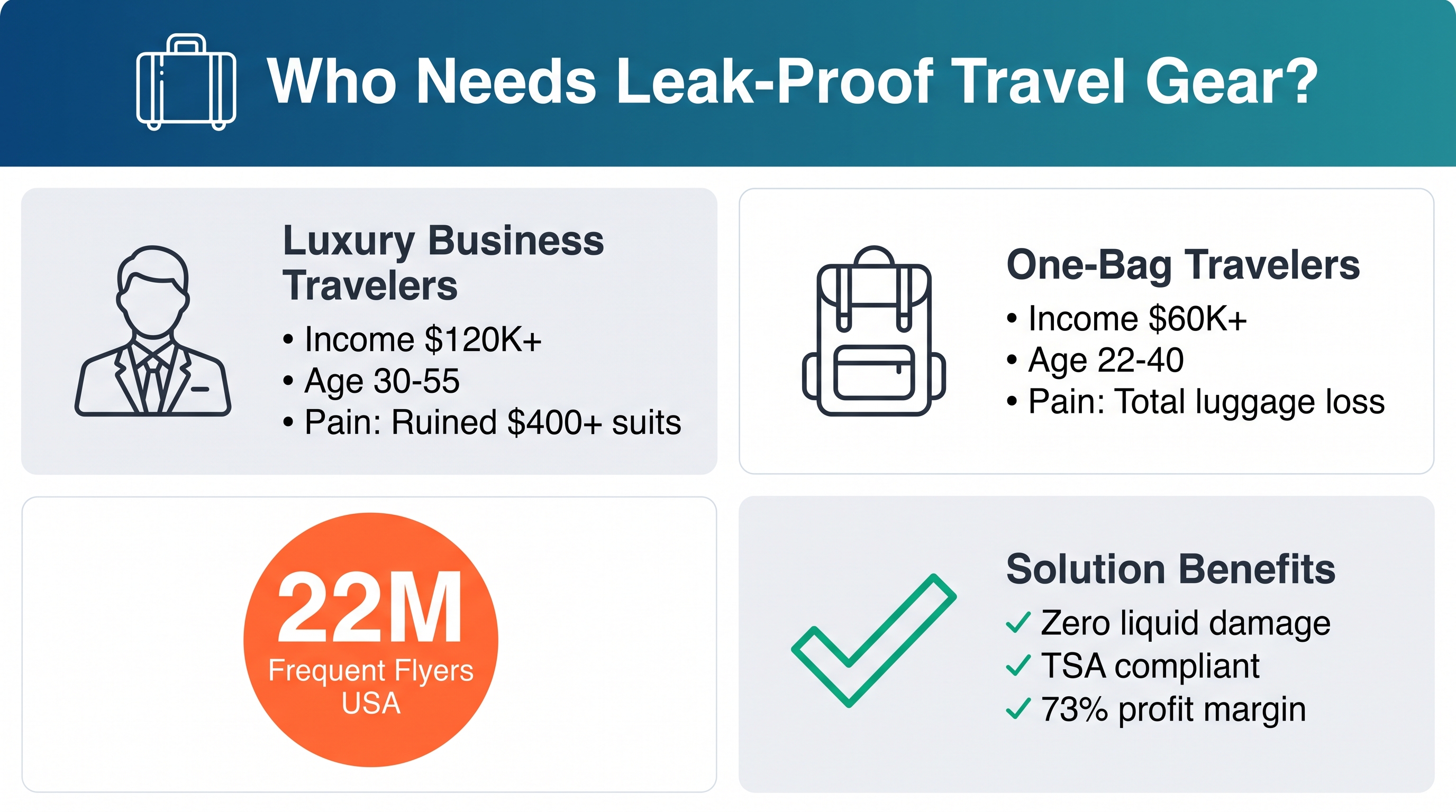 - Pain point: One leak ruins their entire luggage set.