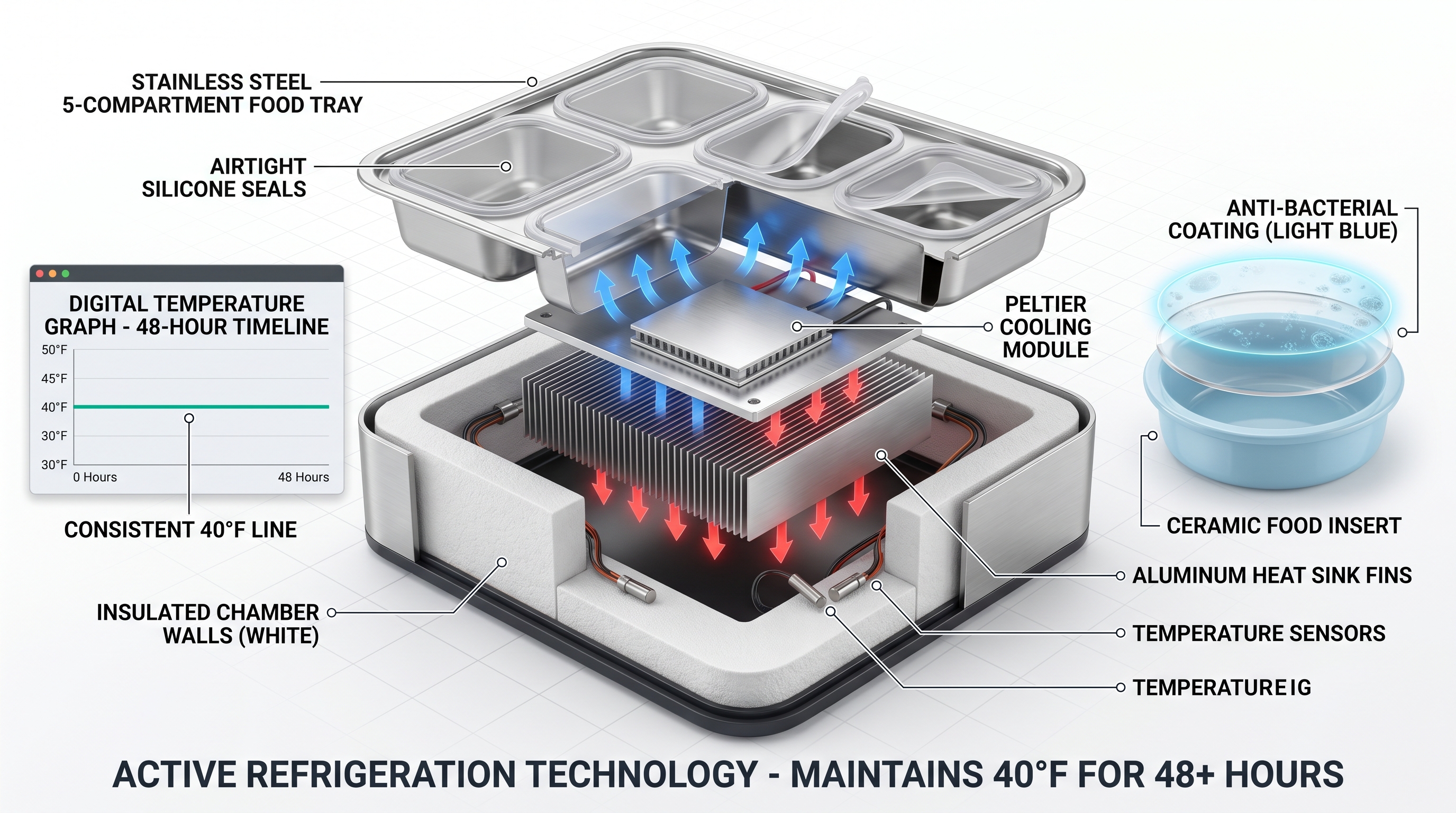 - Solves: Maintains food safety through thermoelectric (Peltier) cooling.