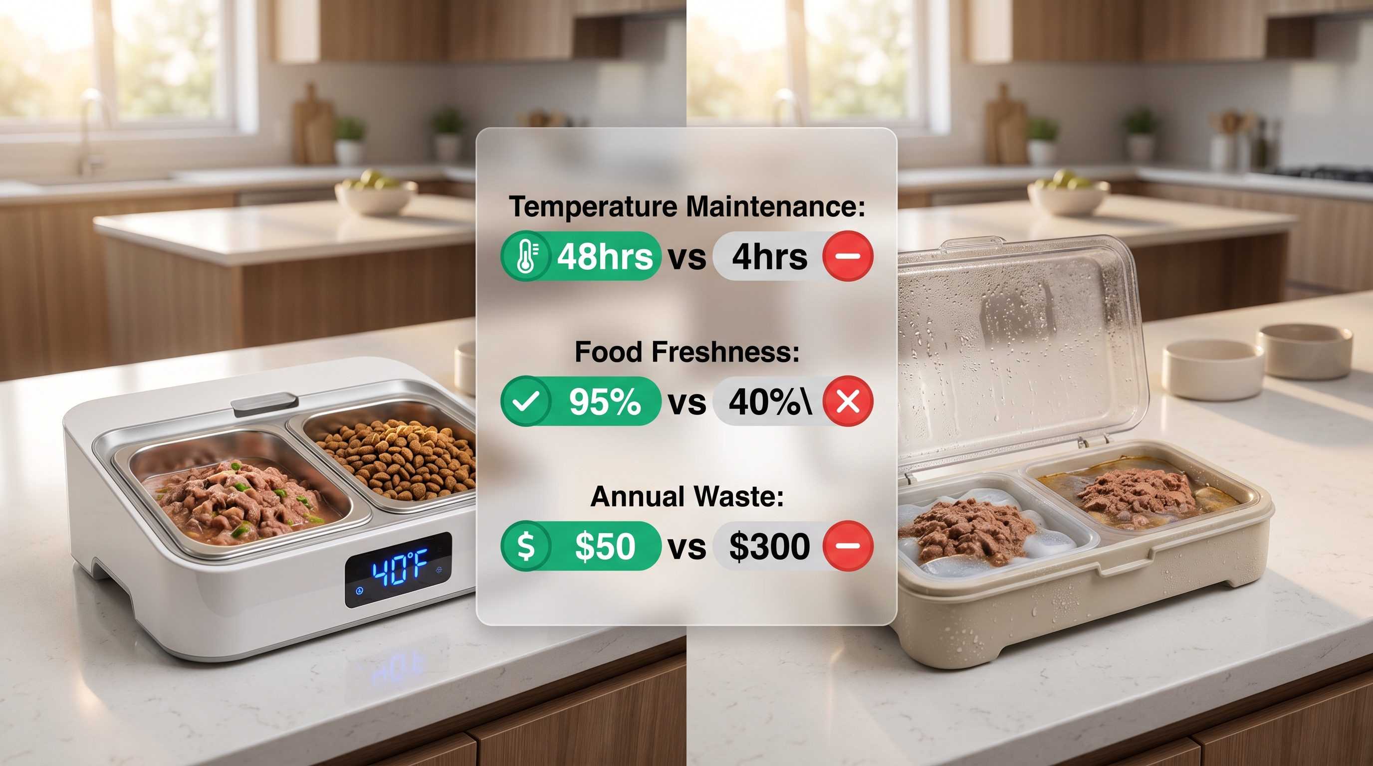 Pet owners lose an average of $300 annually in wasted wet food due to inadequate cooling in traditional automatic feeders.
