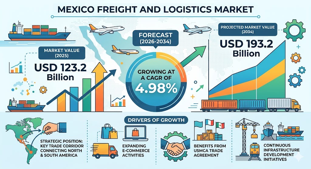 Mexico's freight and logistics market reached USD 123.2 billion in 2025 and is projected to grow to USD 193.2 billion by 2034 at a 4.98% CAGR, creating unprecedented fintech opportunities for cross-border e-commerce sellers. This expansion, driven by USMCA trade streamlining and nearshoring trends, directly translates to increased payment flows, working capital needs, and currency risk exposure for sellers operating Mexico-US-Canada corridors.